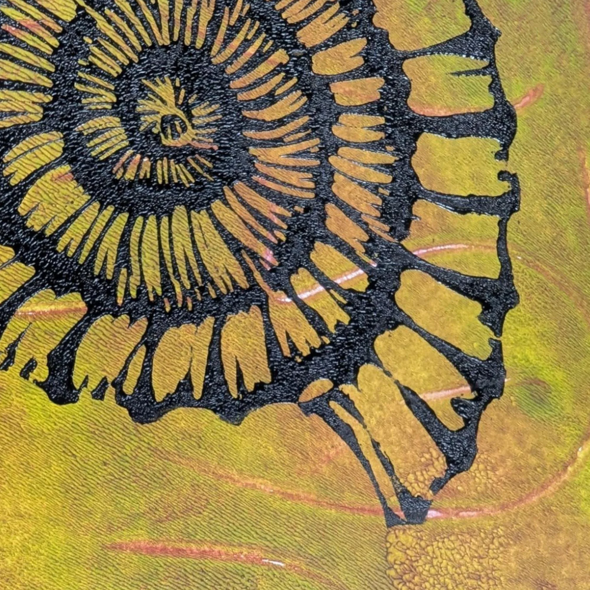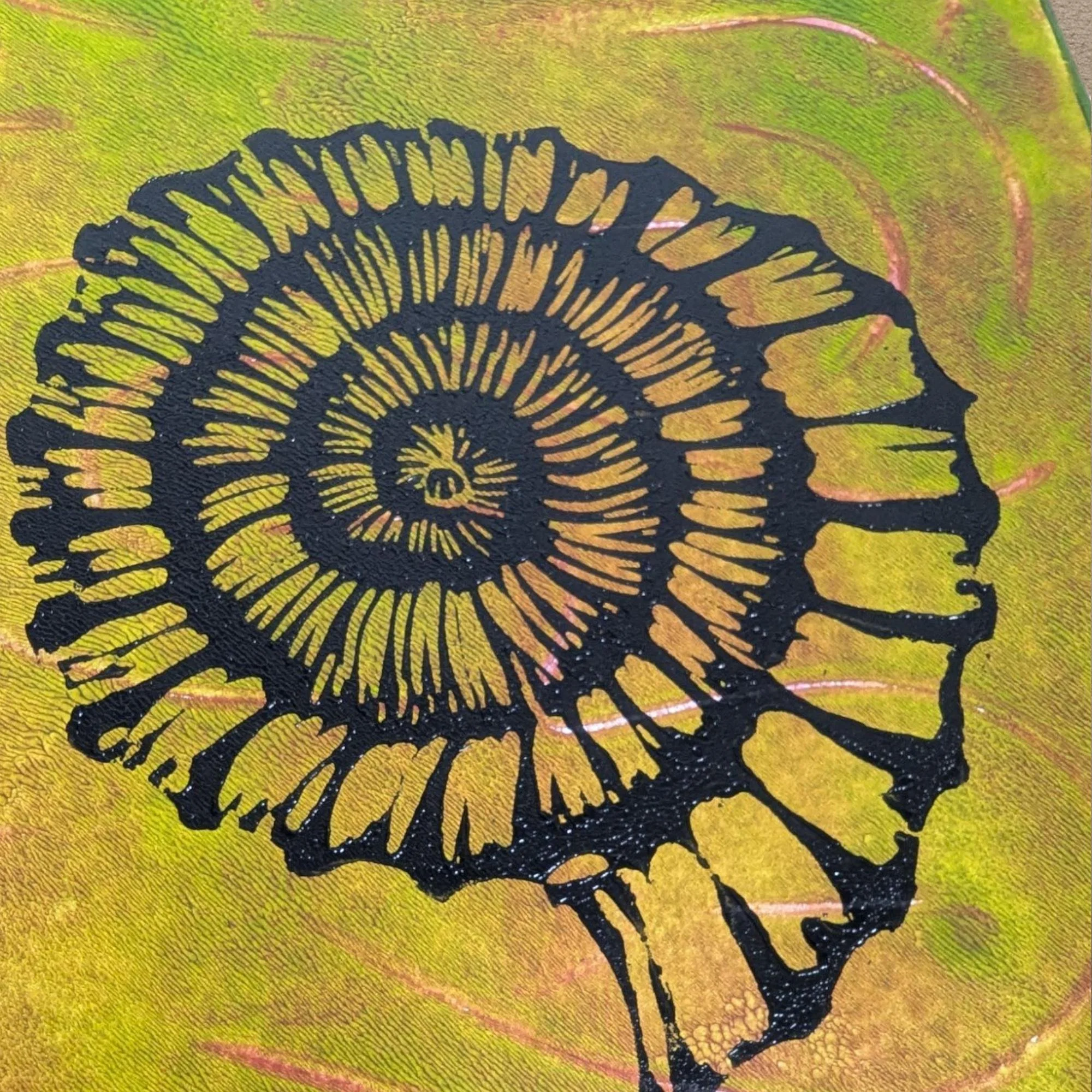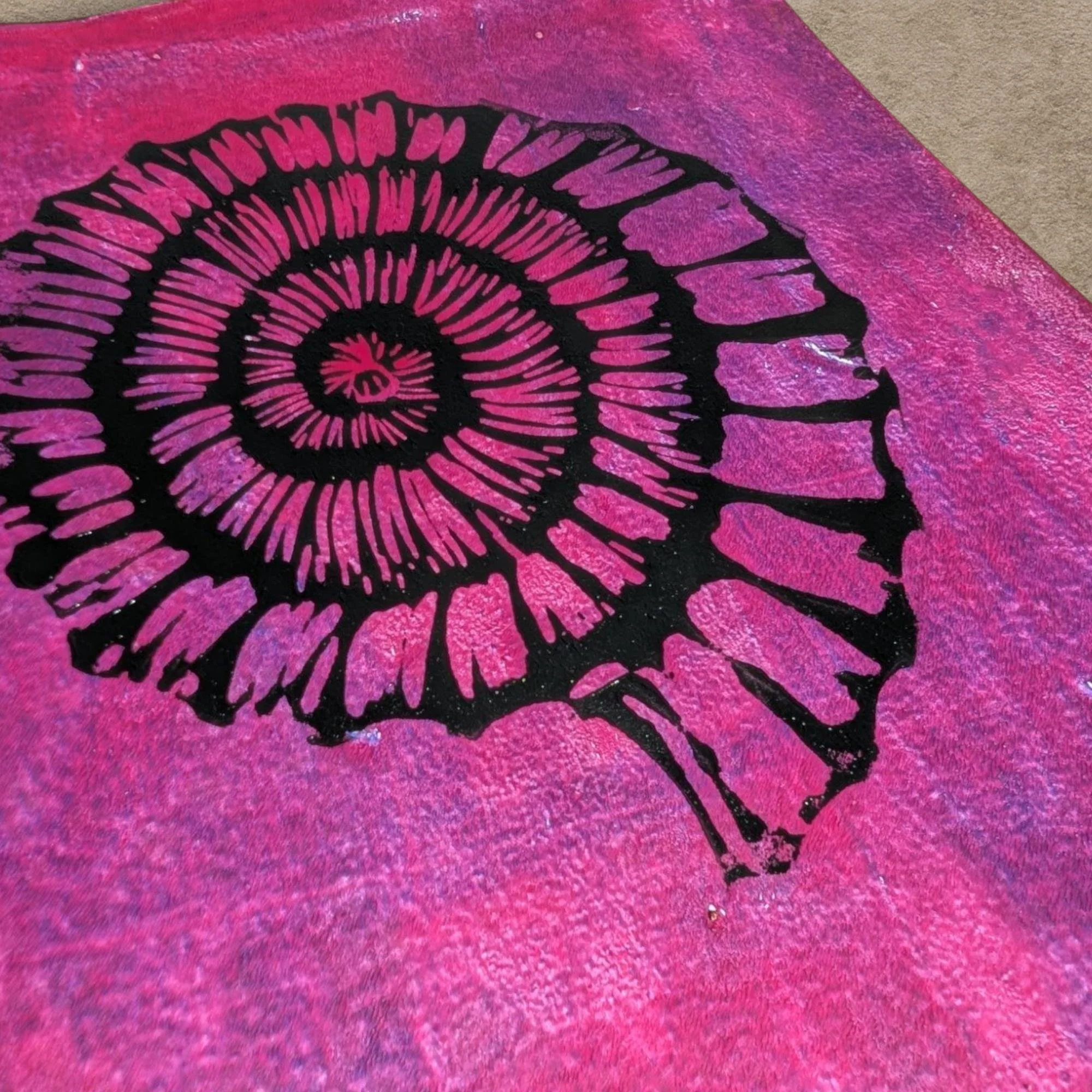 Ammonite: Petal Flame - hand-printed lino print on monoprinted background