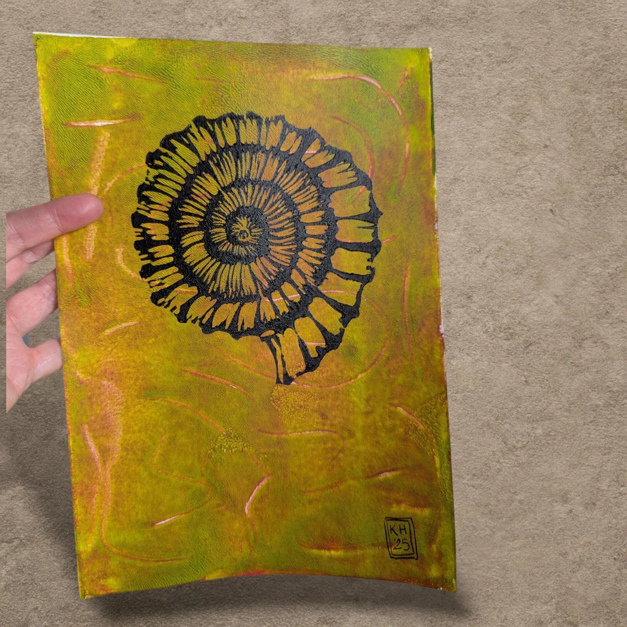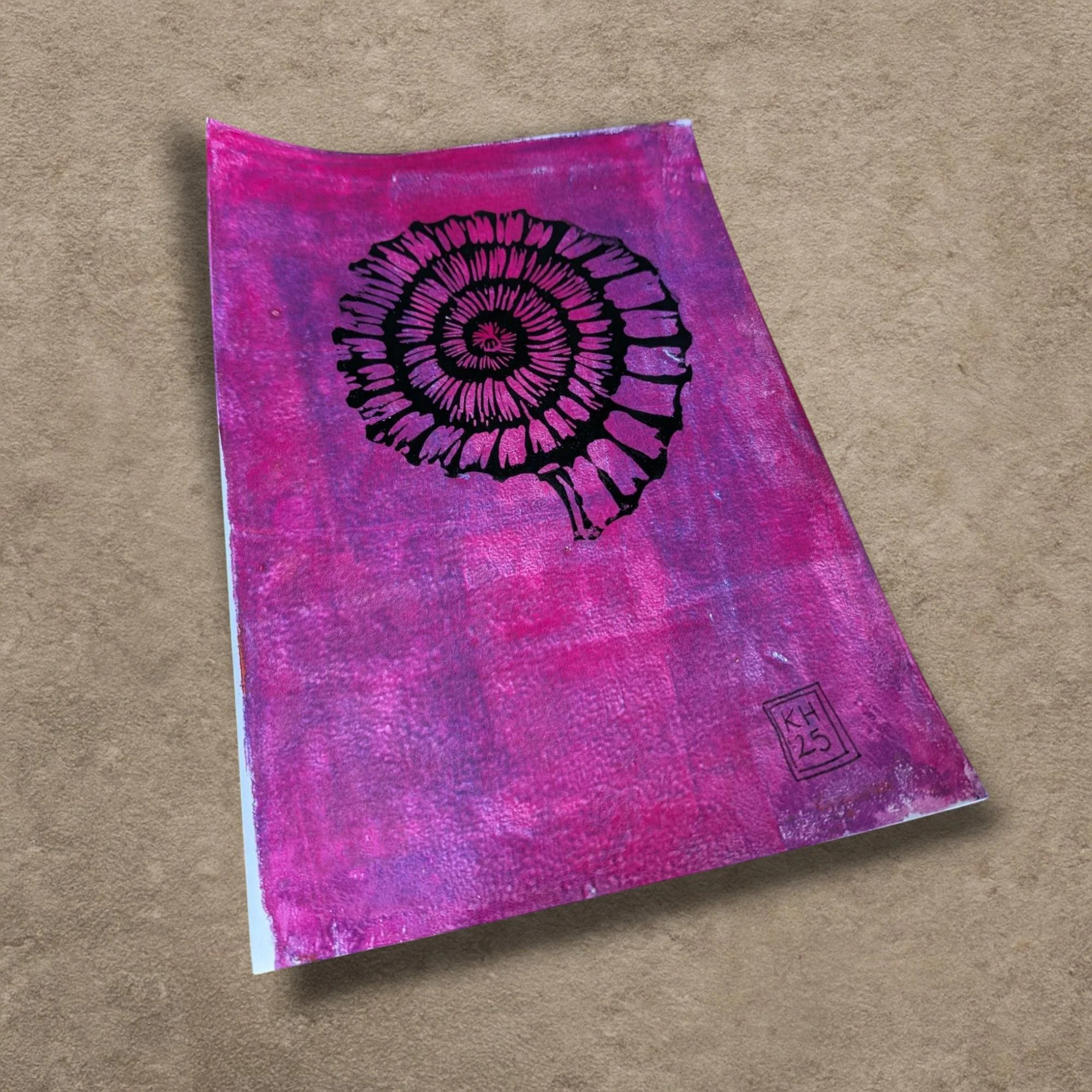A one-of-a-kind artwork featuring an ammonite design, hand-carved in traditional brown lino and printed in ivory black Caligo Safewash ink. For this series, each background has been created using gelliprinting - a monoprinting process that builds organic texture and subtle depth.