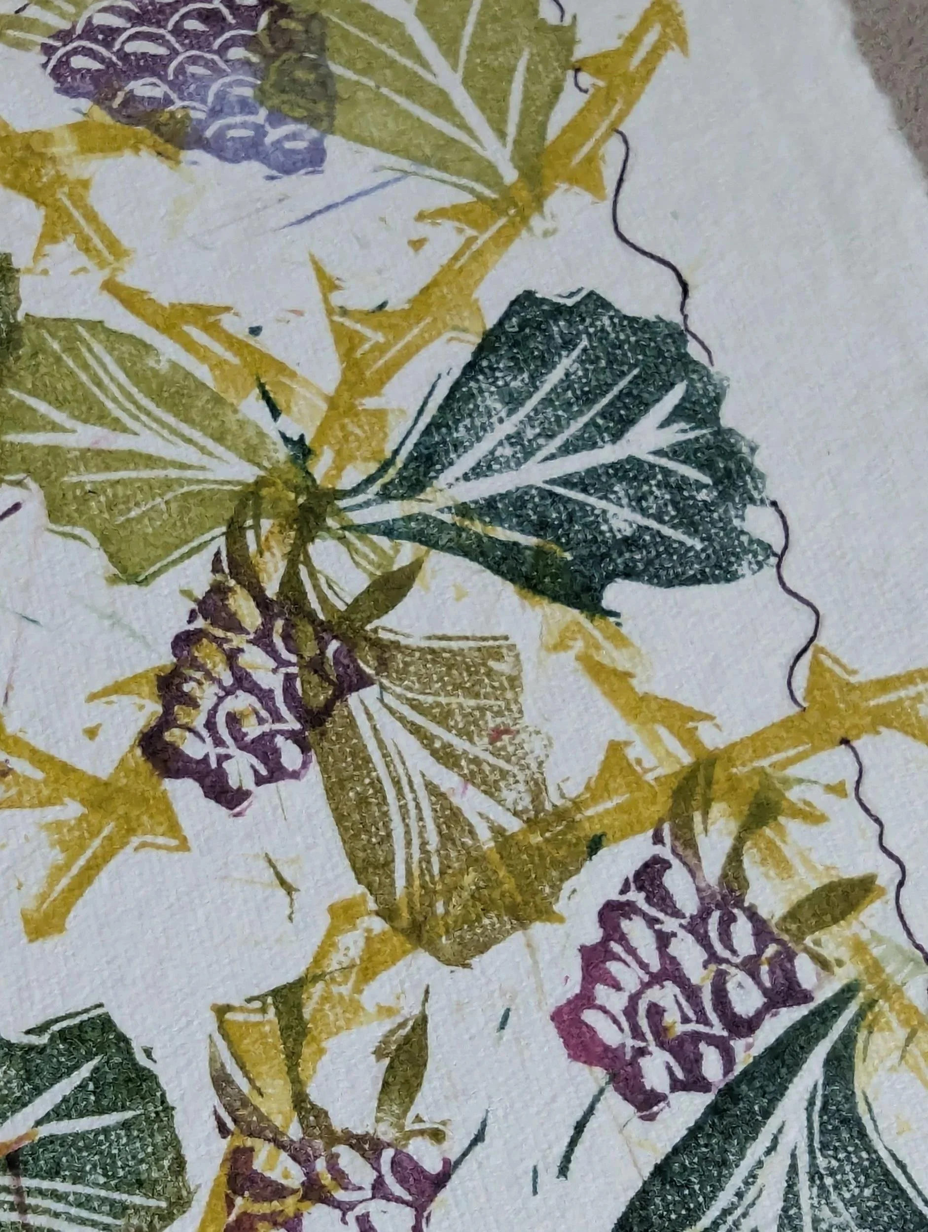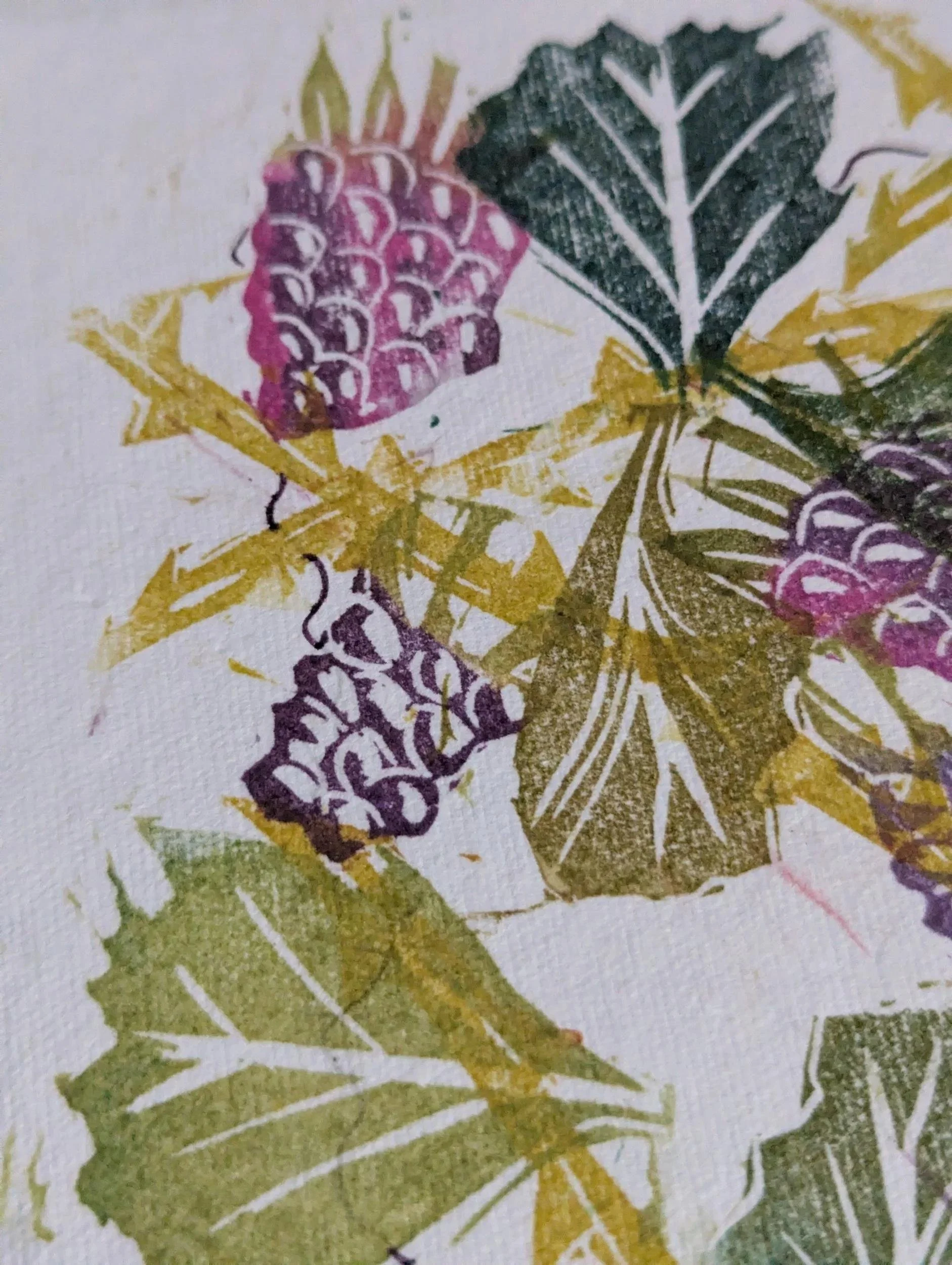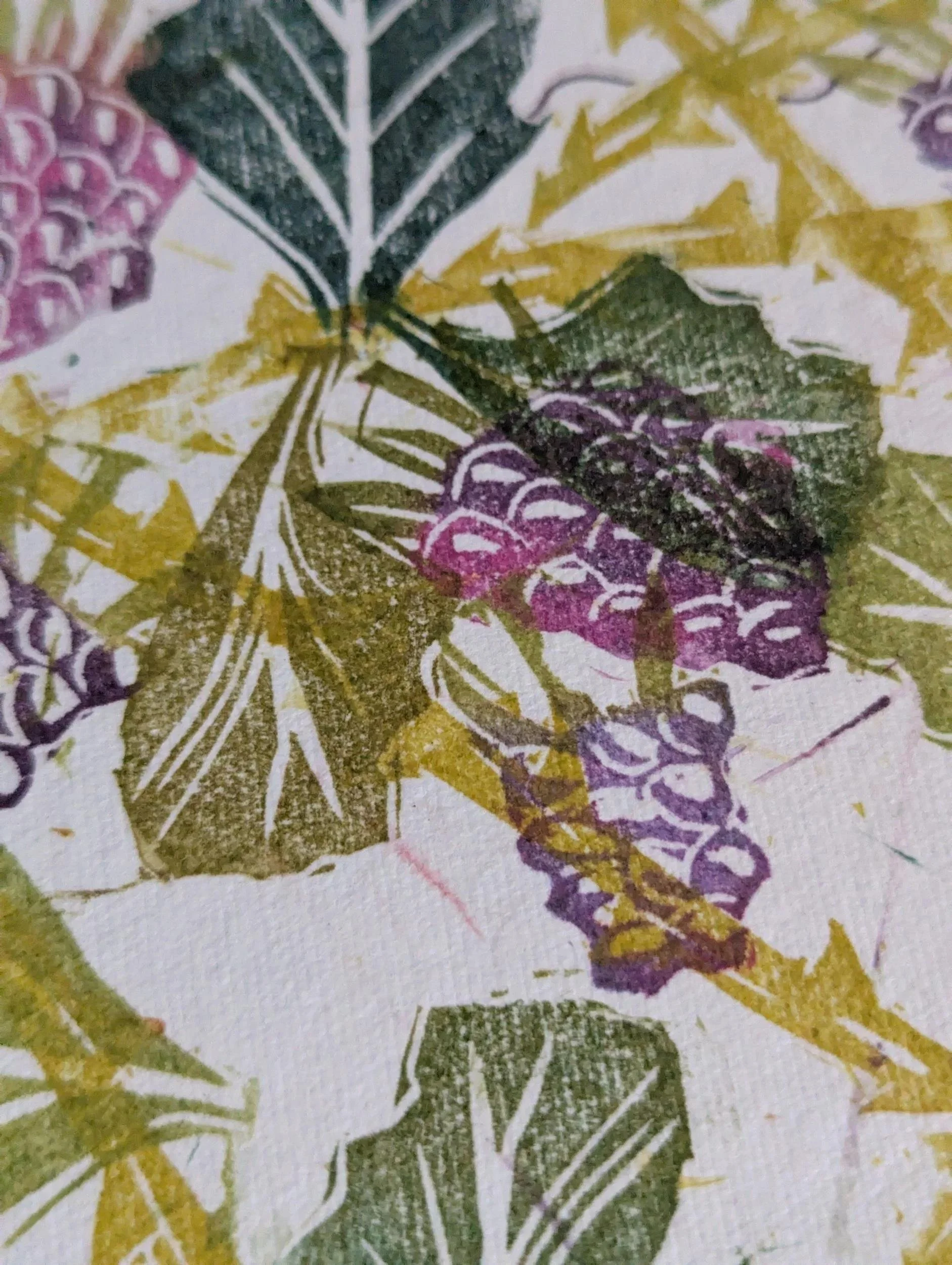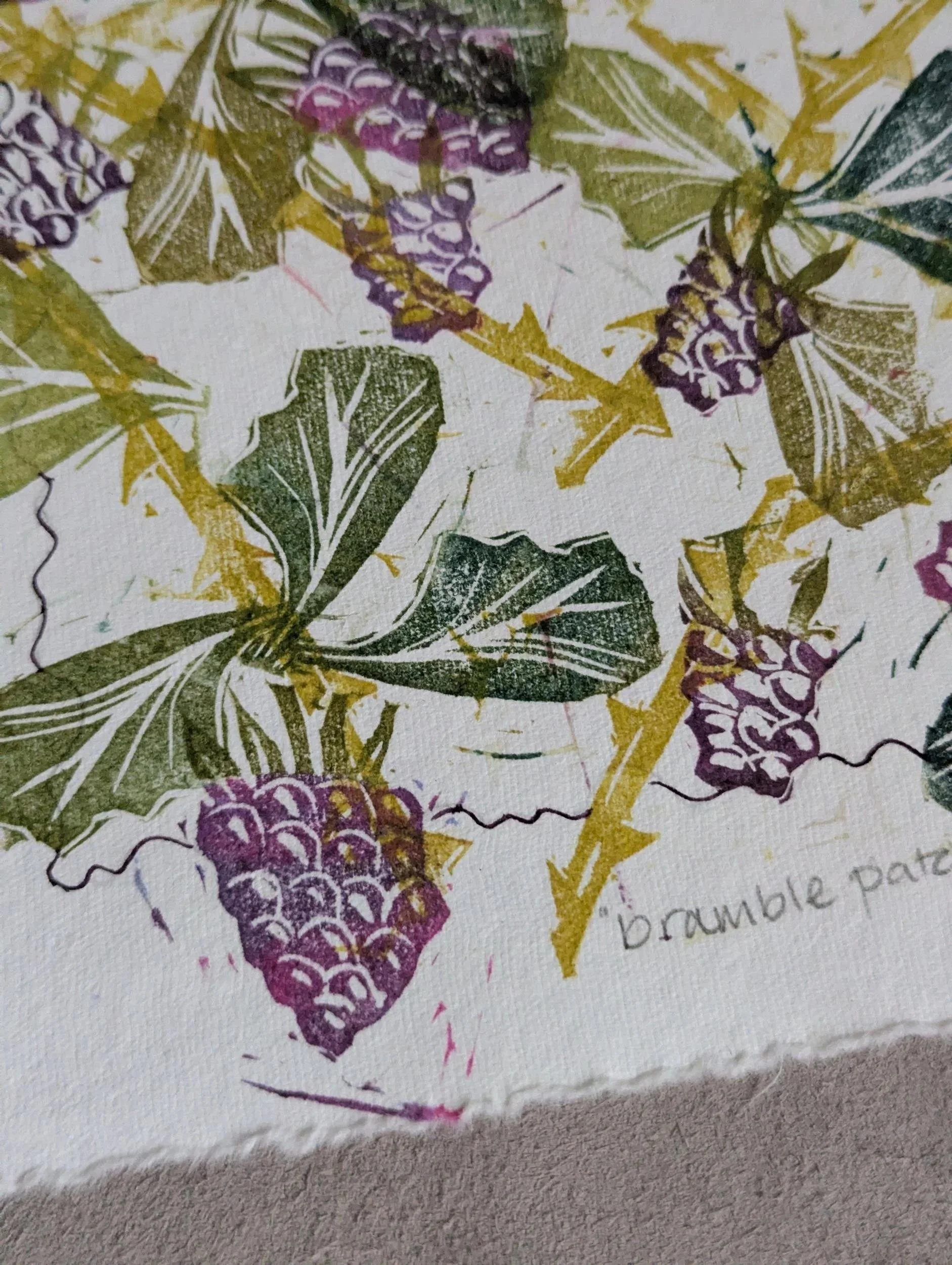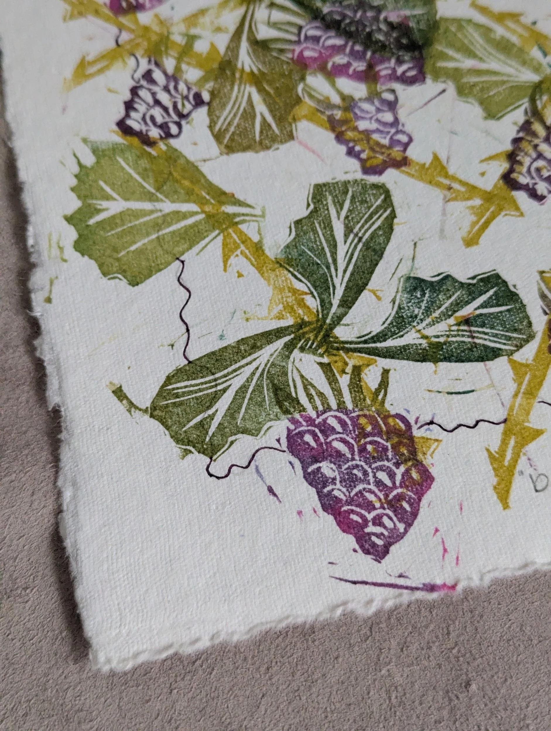 This hand-printed piece captures the humble beauty and higgledy-piggledy nature of a bramble patch. Made from several blocks to depict leaves, thorny branches and juicy blackberries, this monoprint features soft, layered colours and individual placement for a one of a kind piece.
