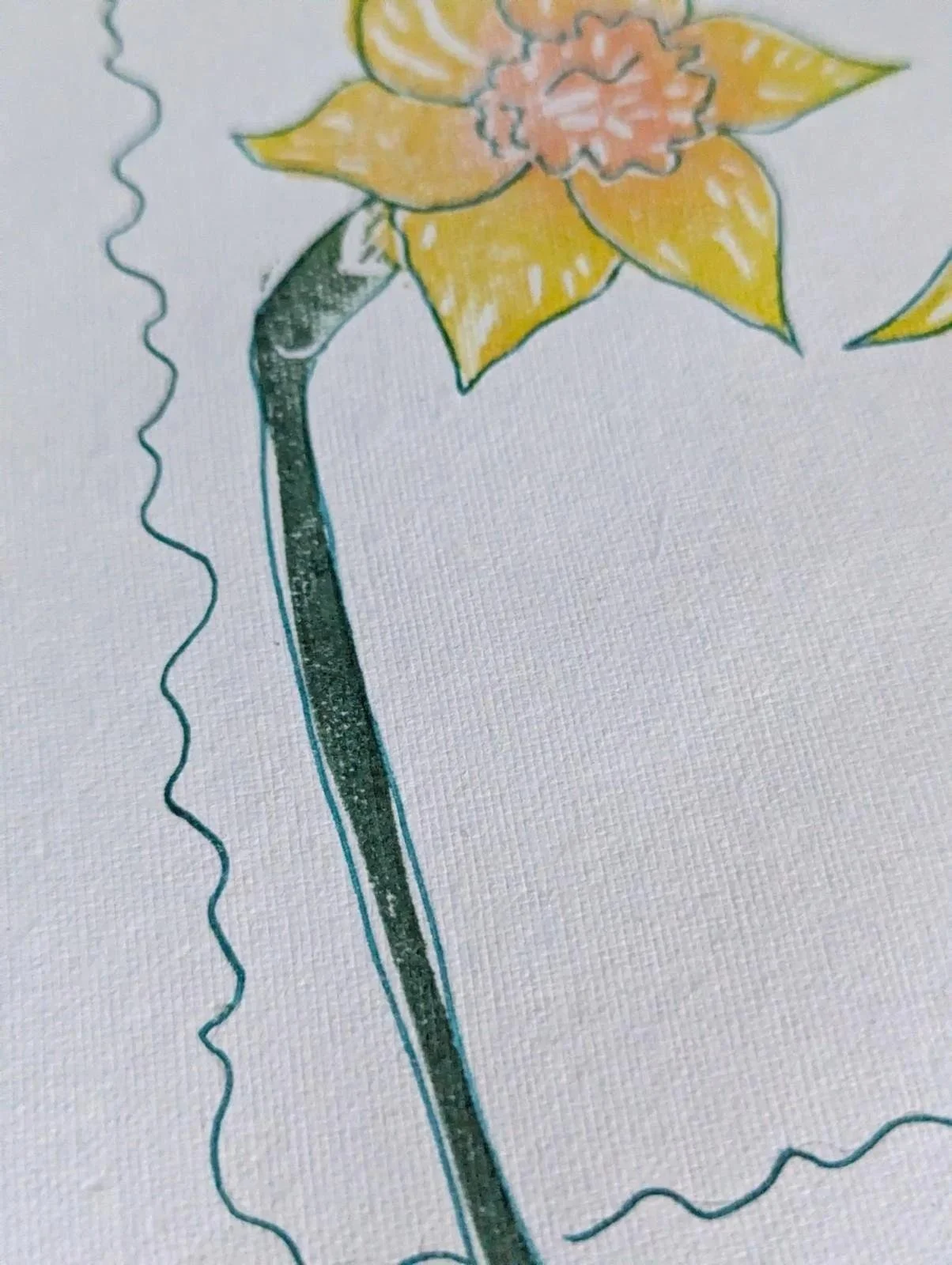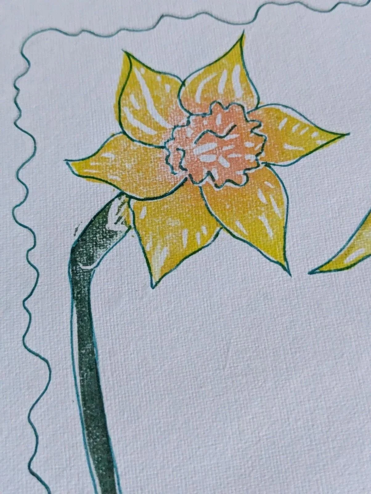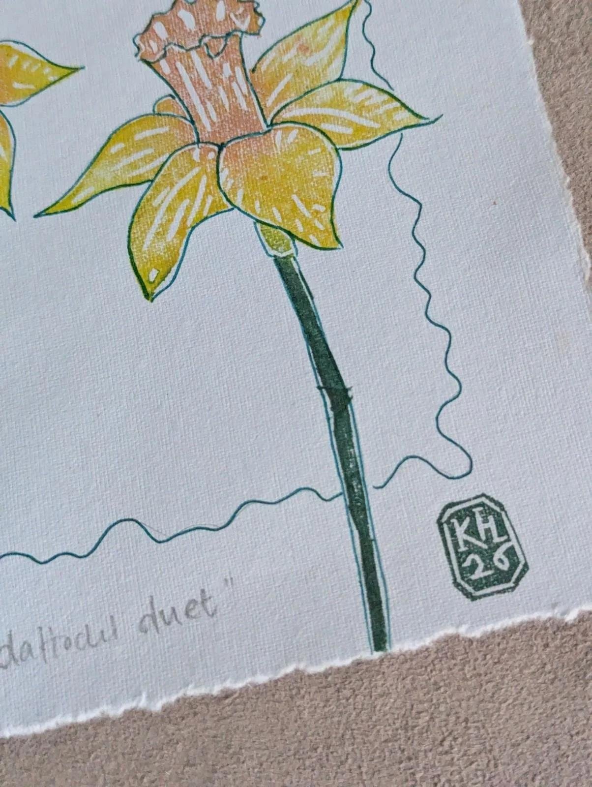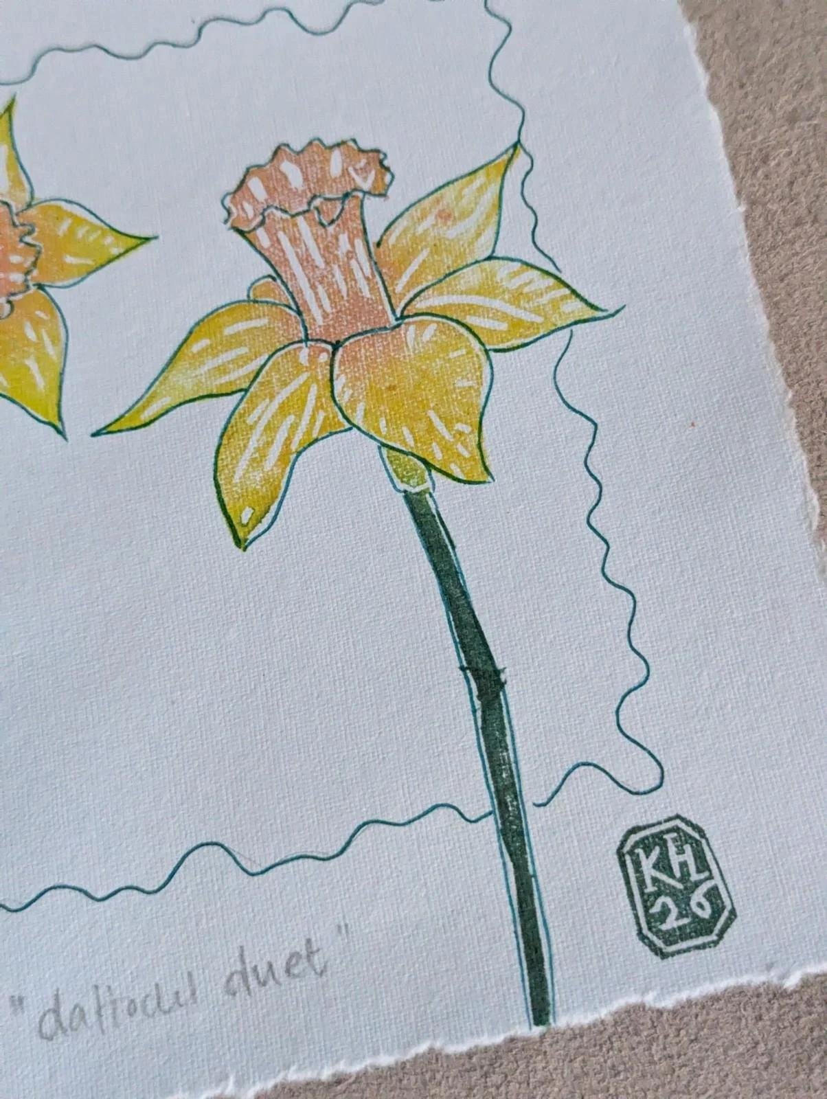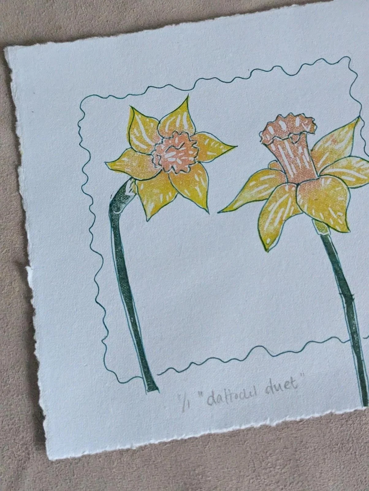 Printed by hand onto a soft powder blue cotton rag paper using hand-carved rubber blocks and a blend of archival inks. Each element has small differences in tone and texture, which is part of what makes it feel human and lived-in. On this print the daffodils have been outlined with a dark green micron pen also.