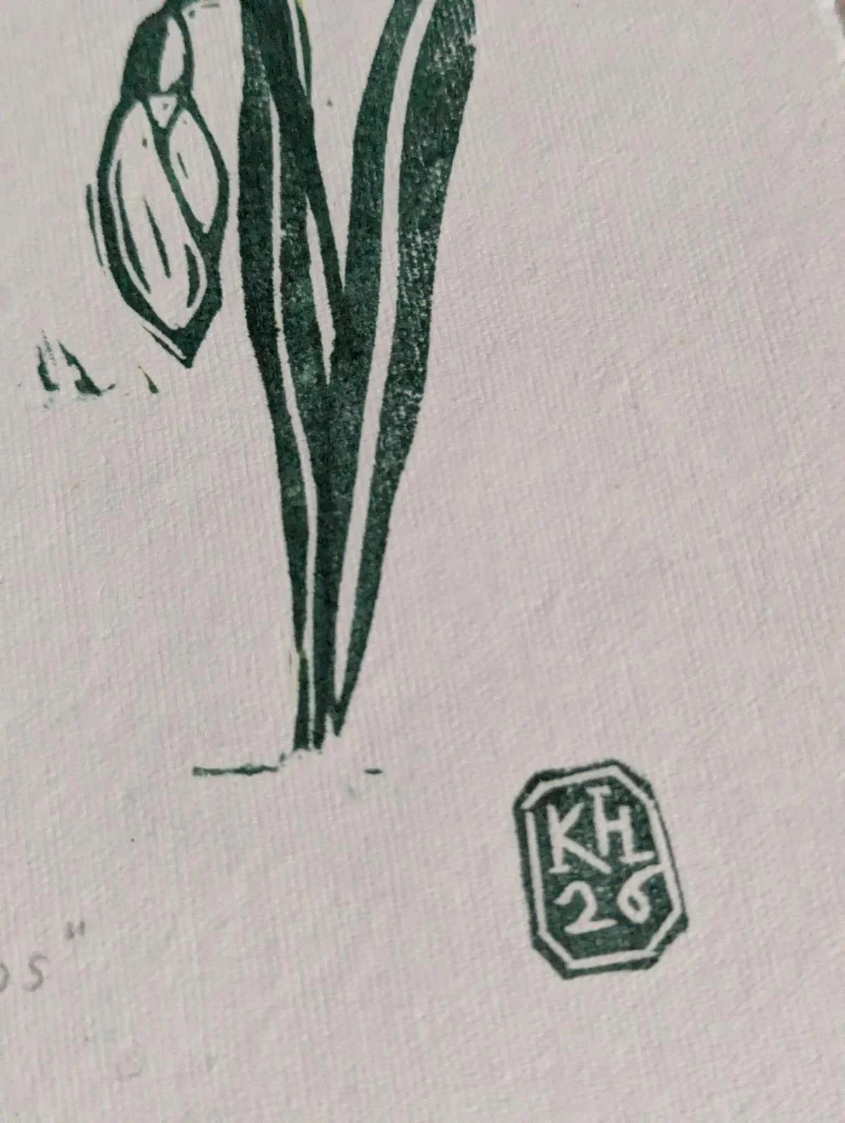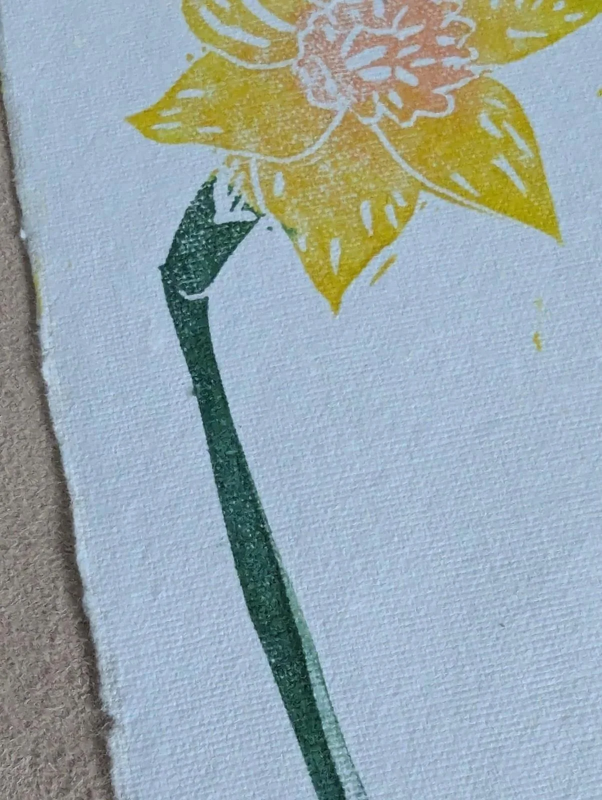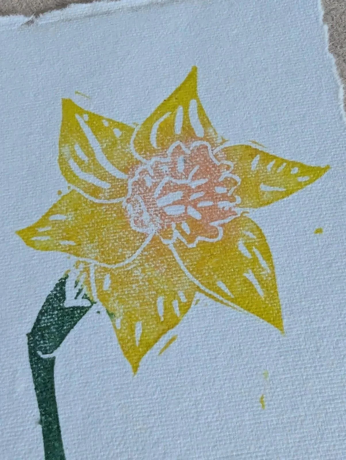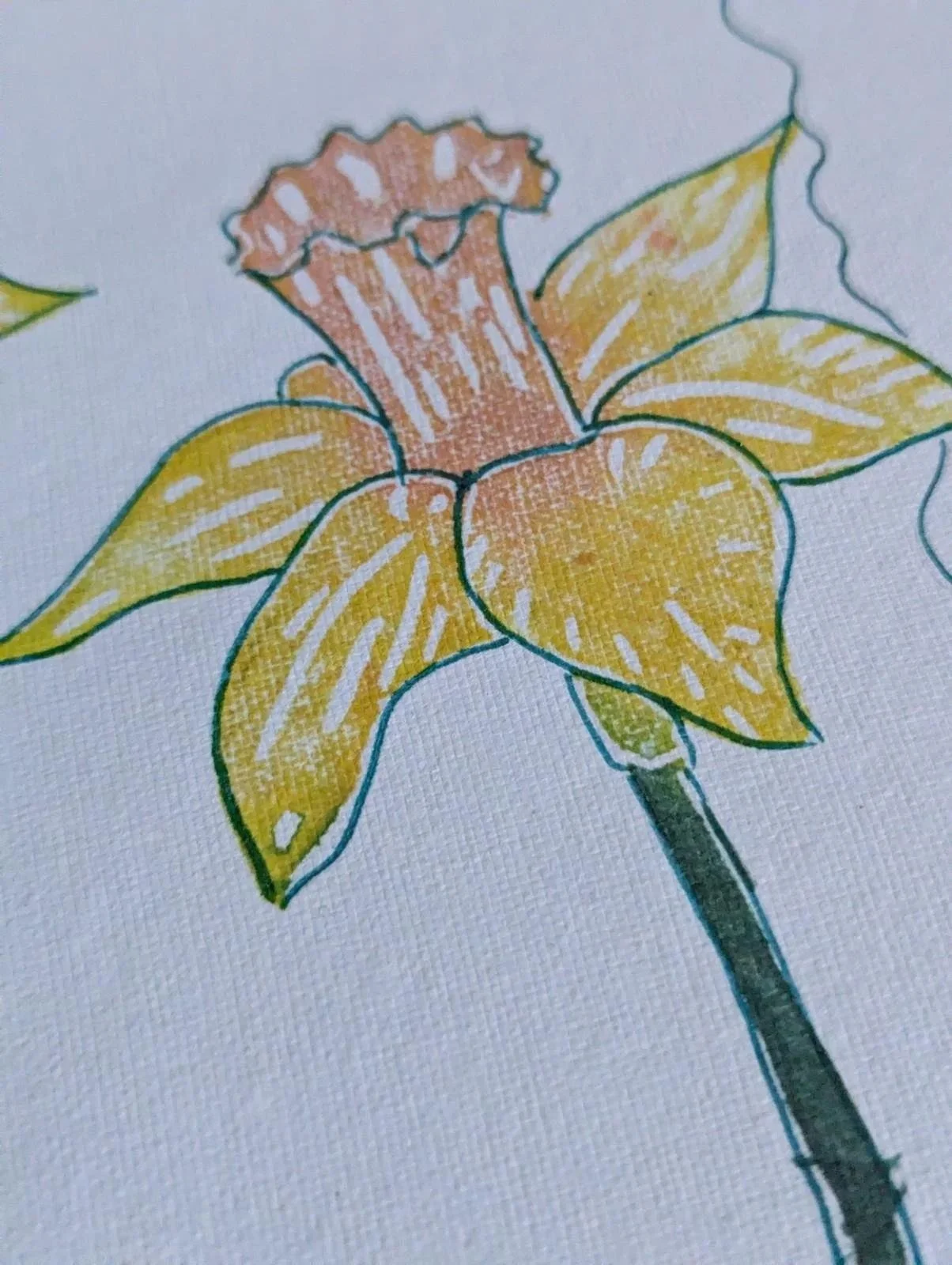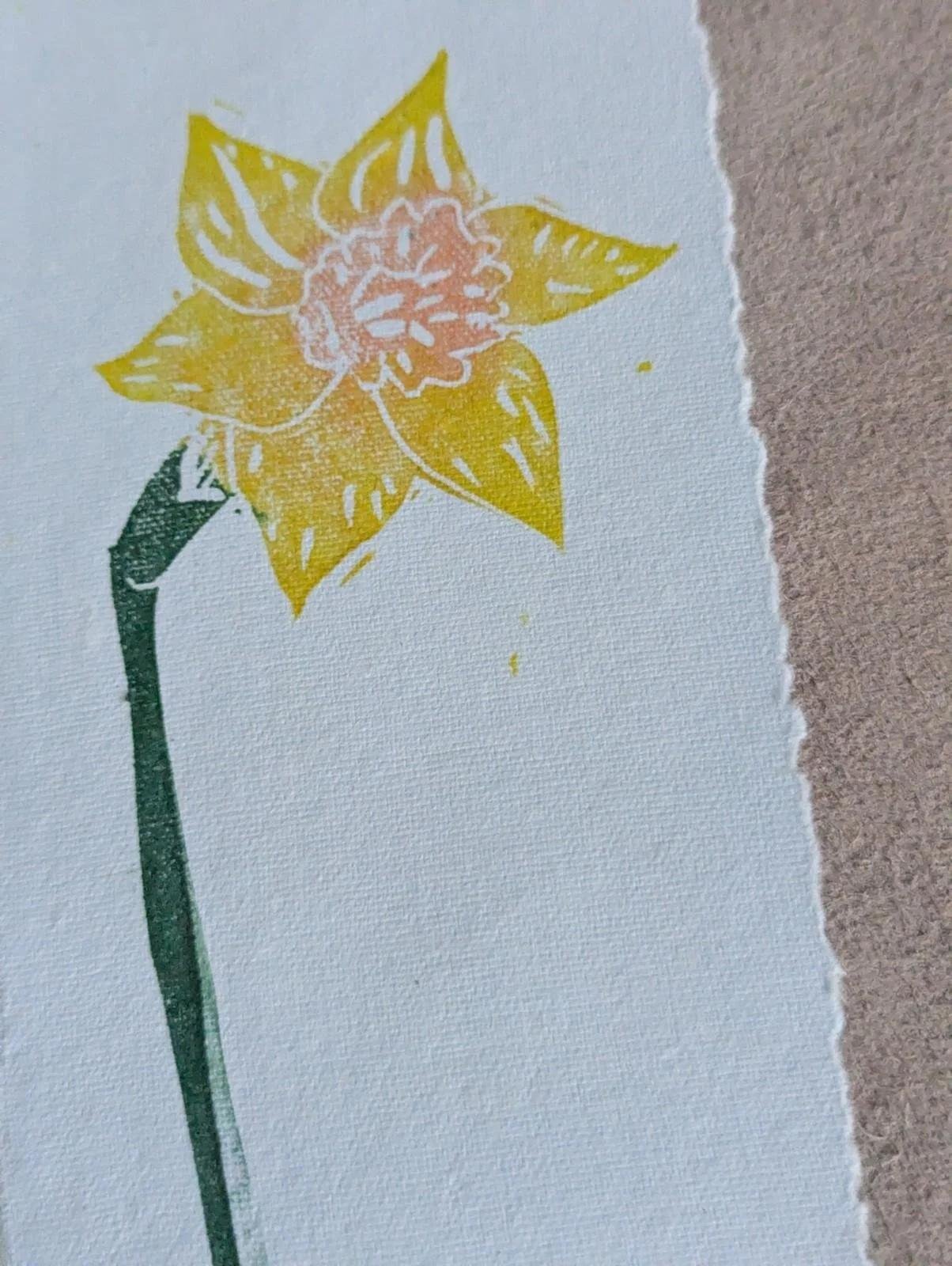 Printed by hand onto a soft powder blue cotton rag paper using hand-carved rubber blocks and a blend of archival inks. Each element has small differences in tone and texture, which is part of what makes it feel human and lived-in. On this print the daffodils have been outlined with a dark green micron pen also.