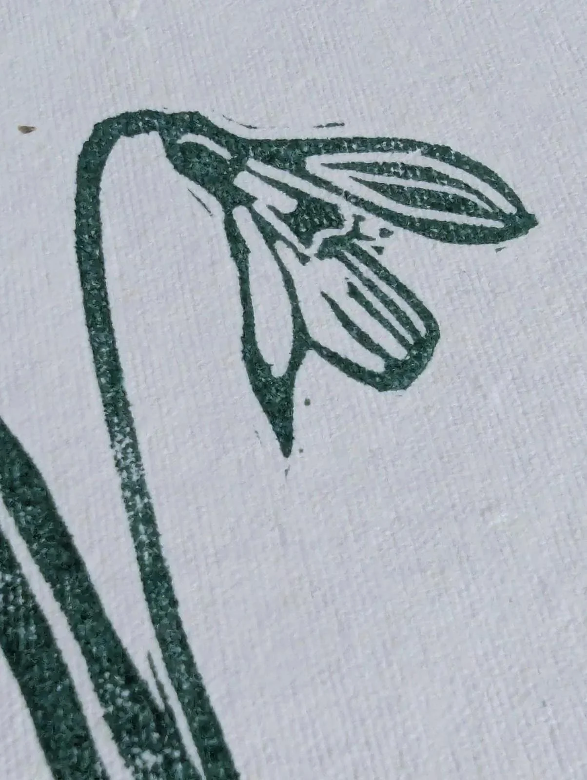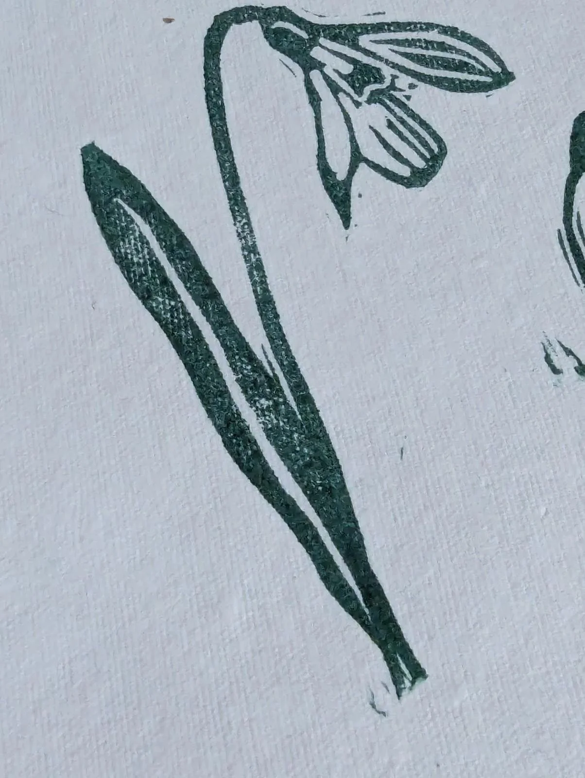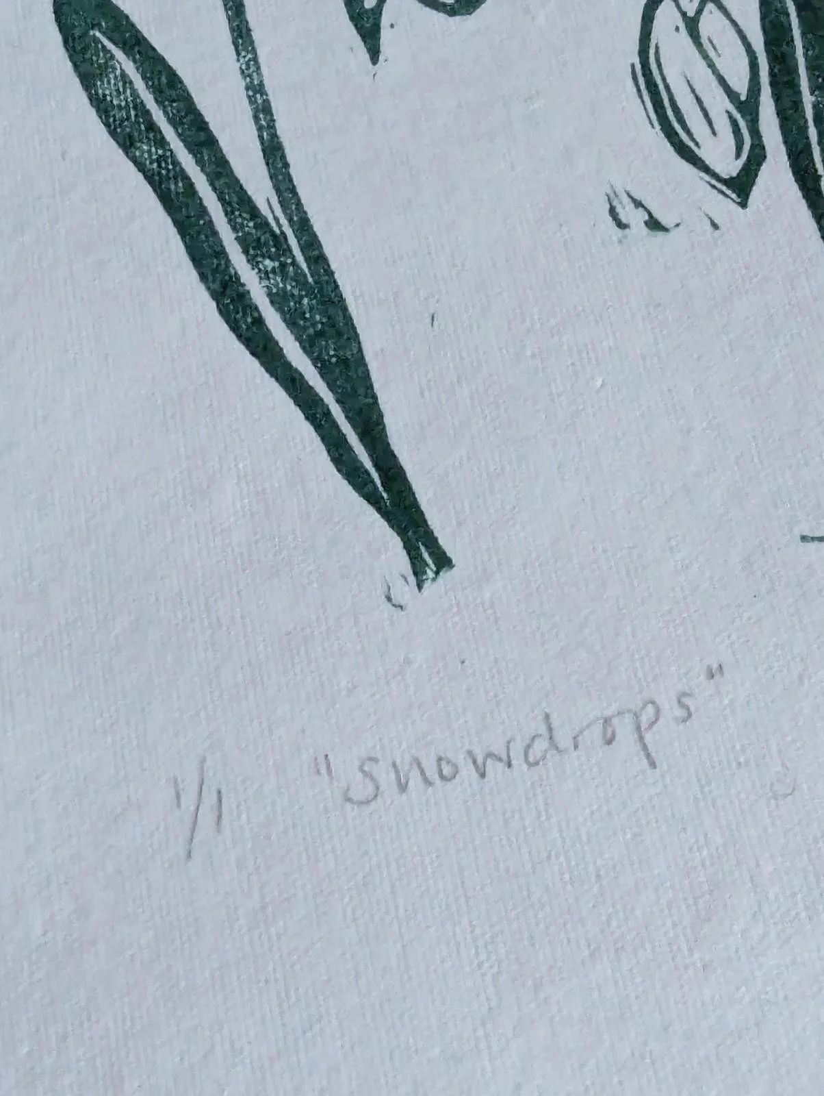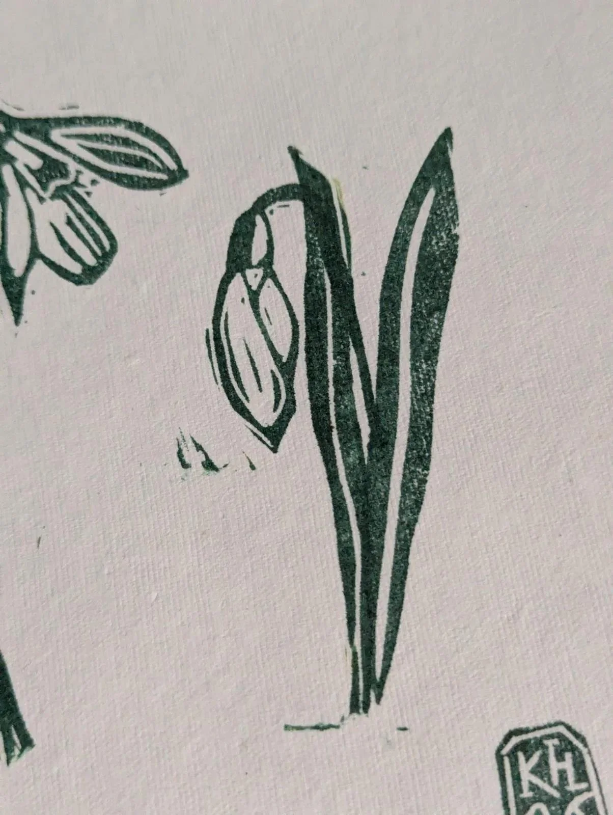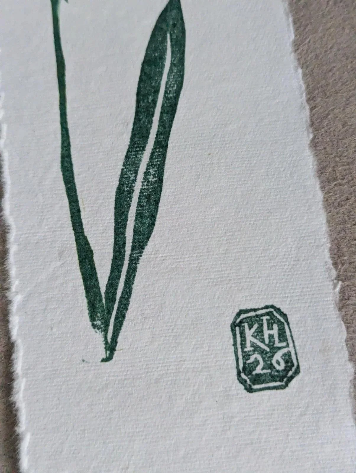 Printed by hand onto a soft powder blue cotton rag paper using hand-carved rubber blocks and a blend of archival inks. Each element has small differences in tone and texture, which is part of what makes it feel human and lived-in. On this print the daffodils have been outlined with a dark green micron pen also.