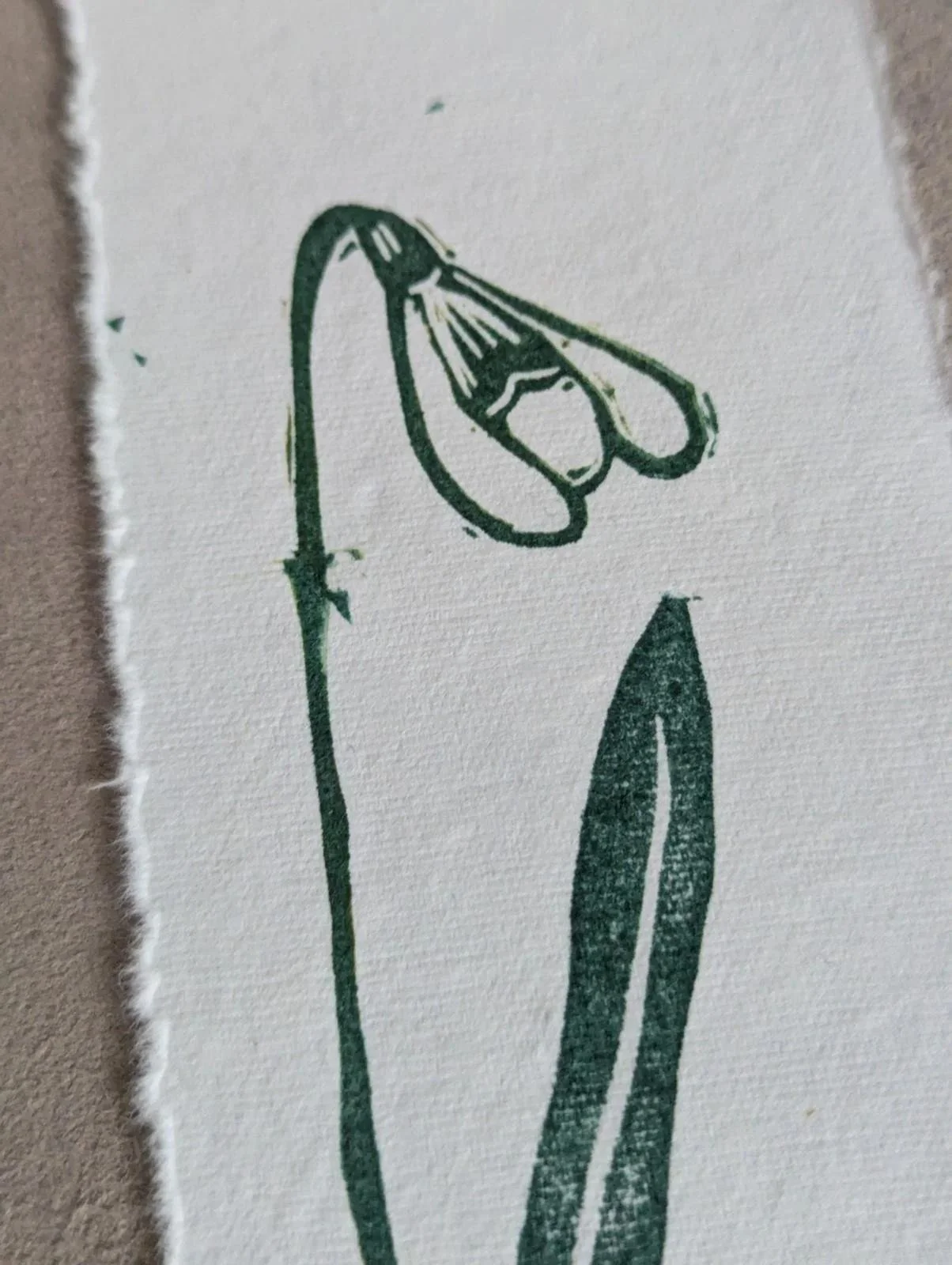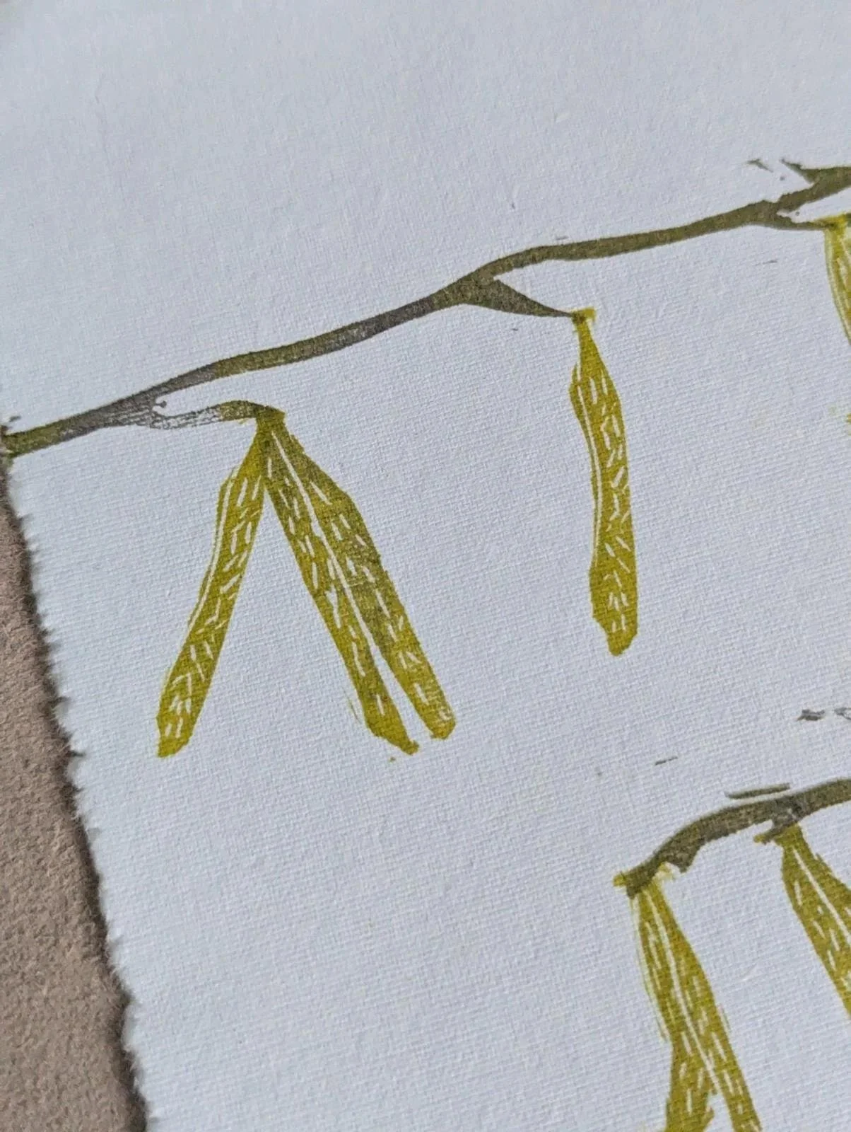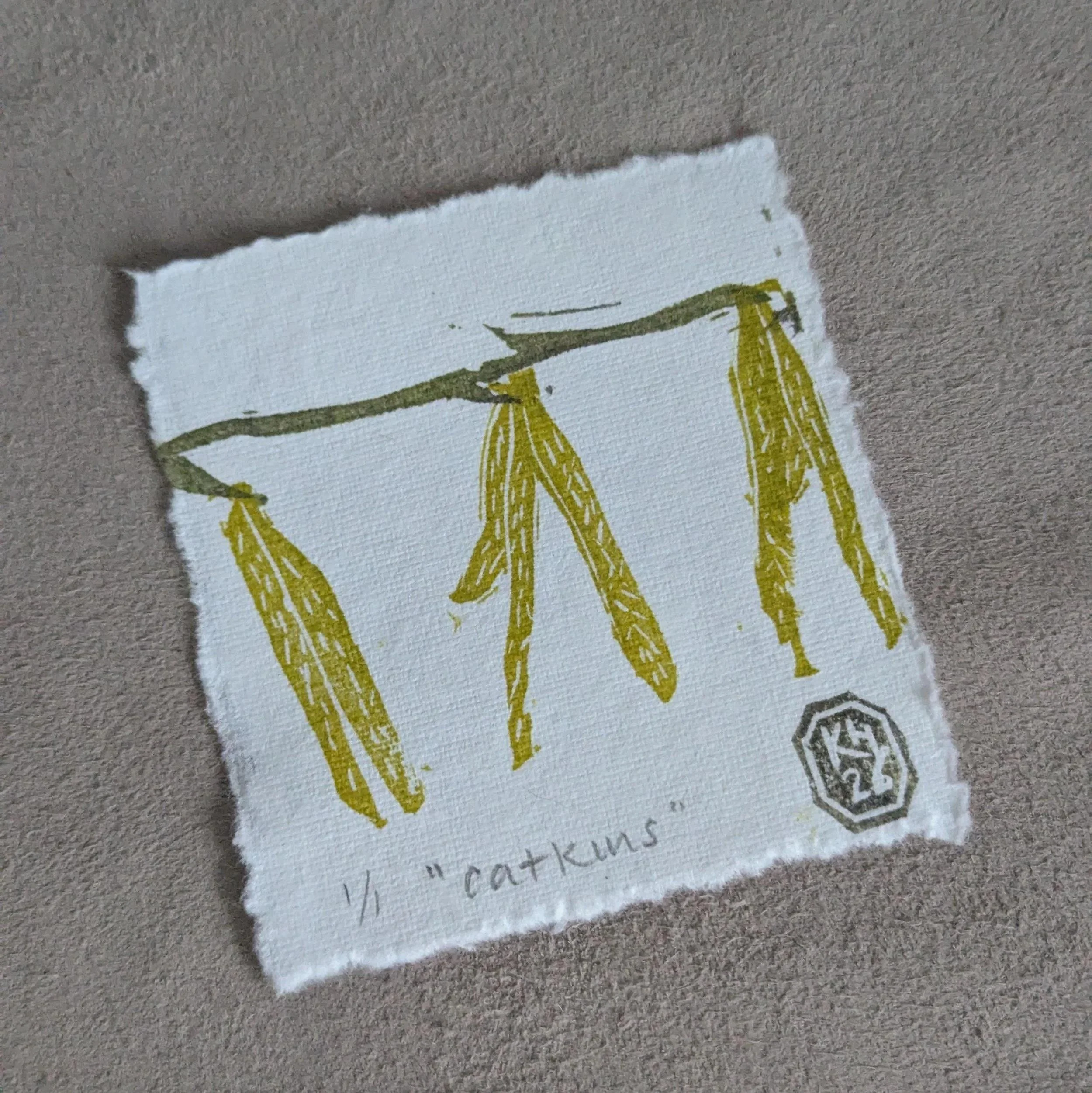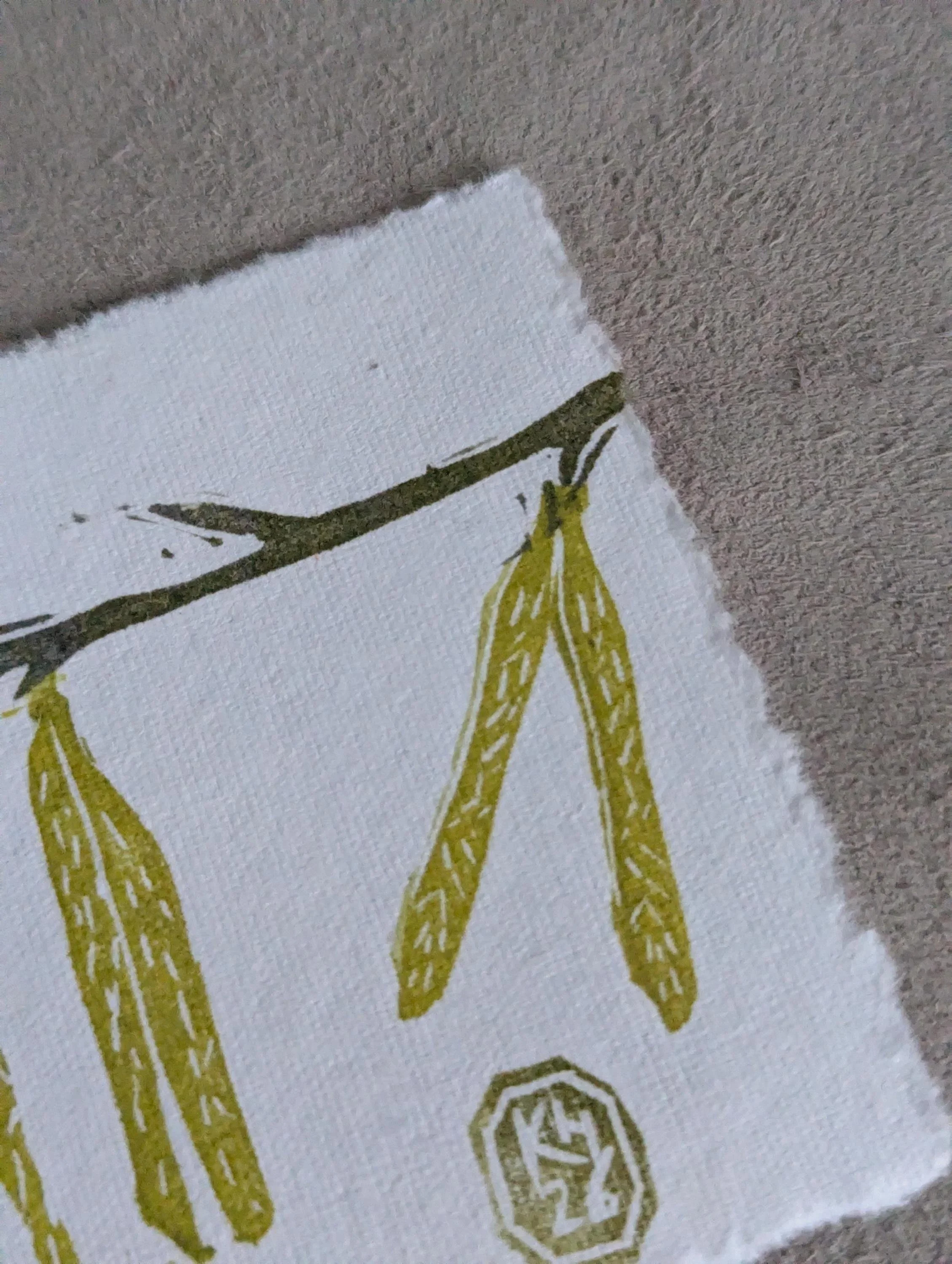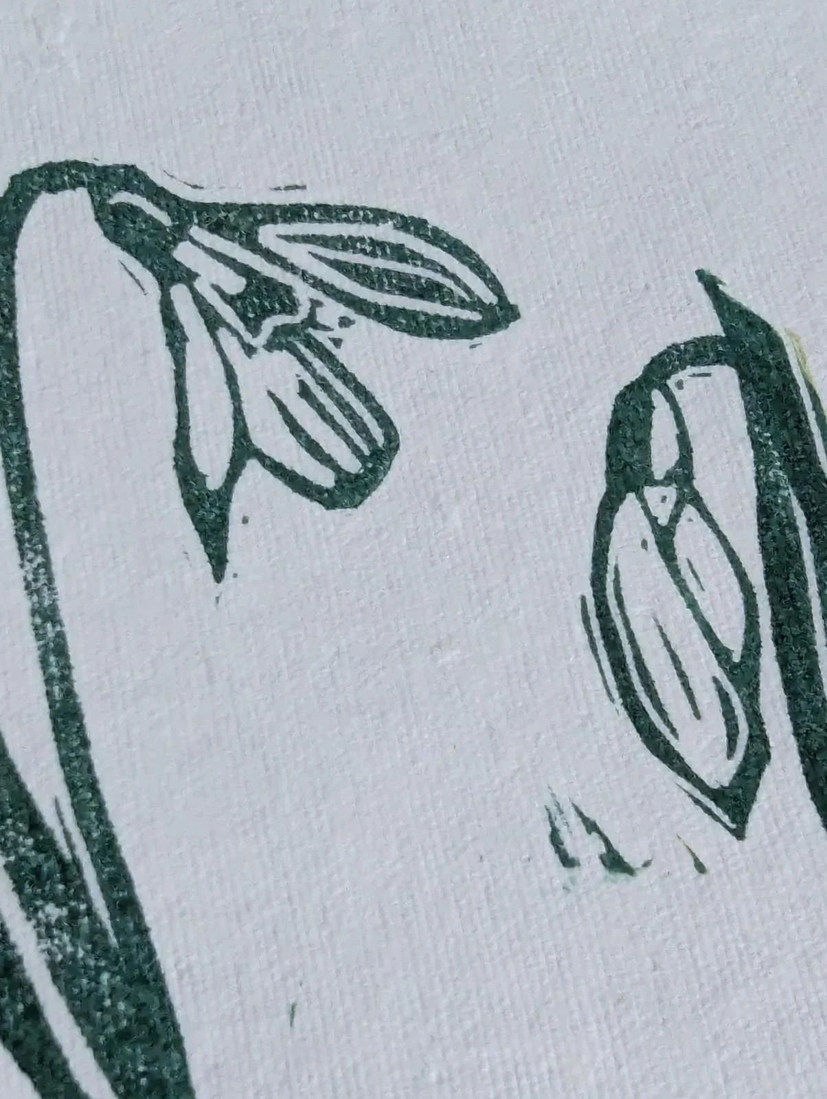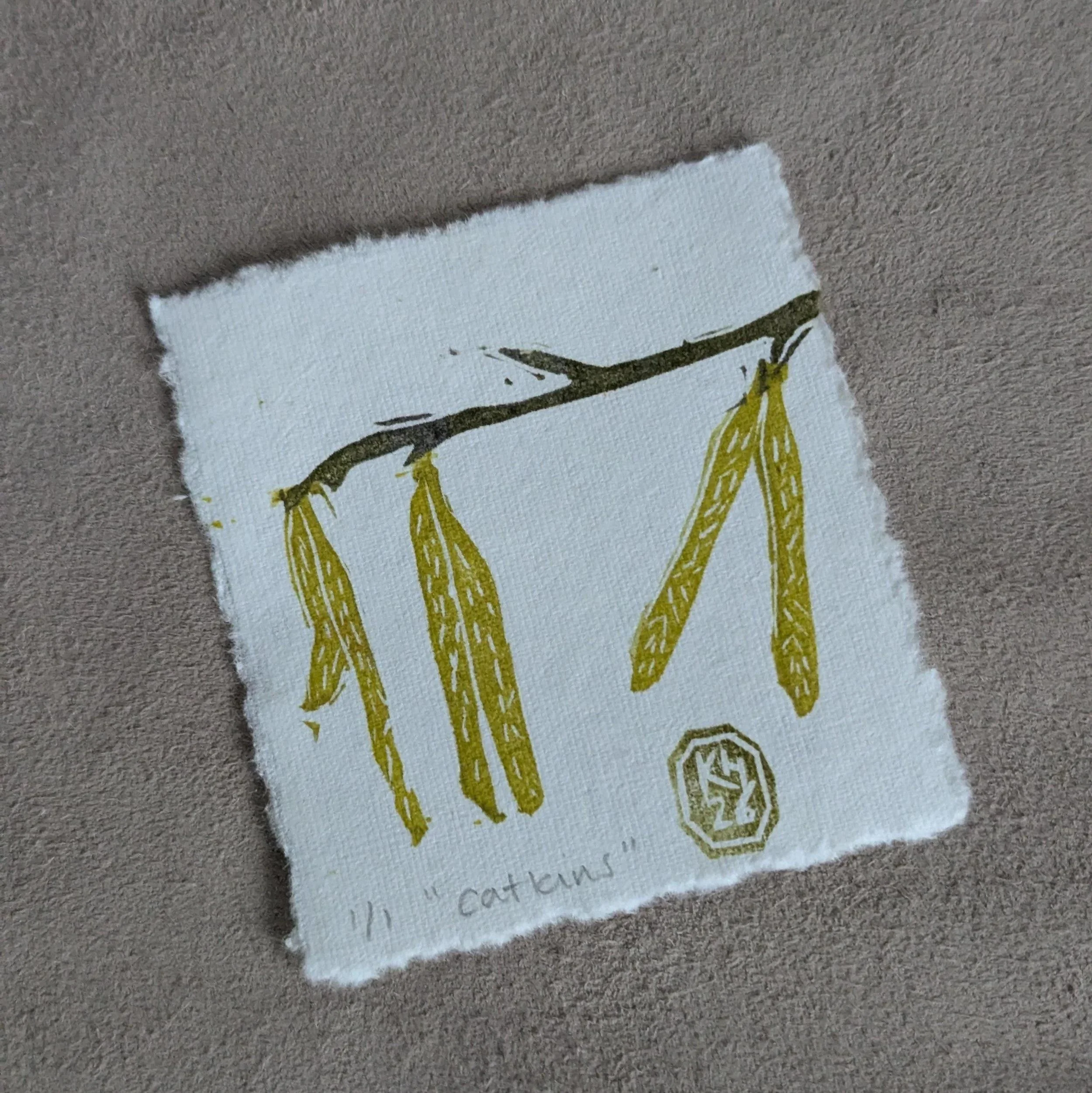 Printed by hand onto a soft powder blue cotton rag paper using hand-carved rubber blocks and a blend of archival inks. Each element has small differences in tone and texture, which is part of what makes it feel human and lived-in. On this print the daffodils have been outlined with a dark green micron pen also.