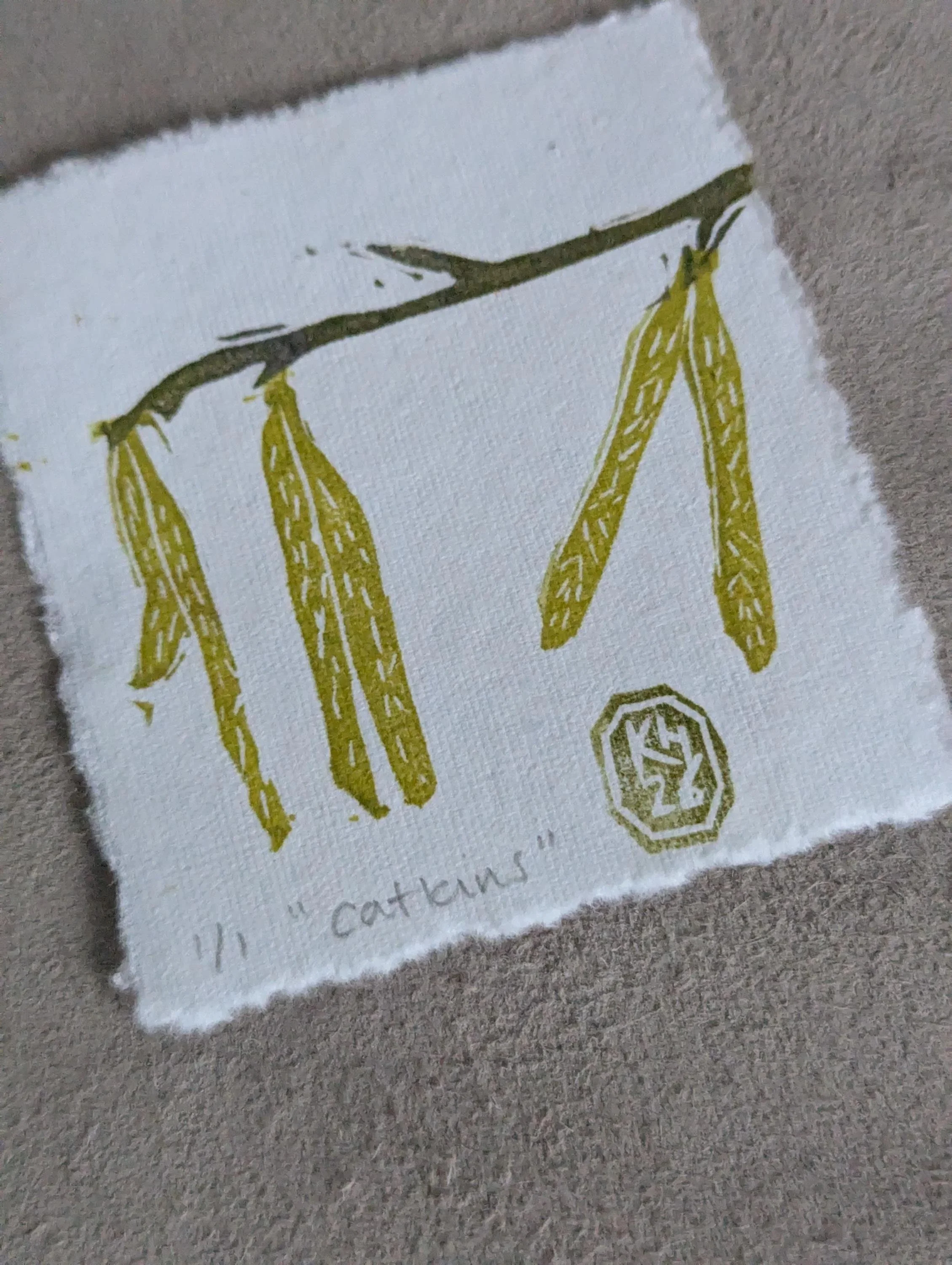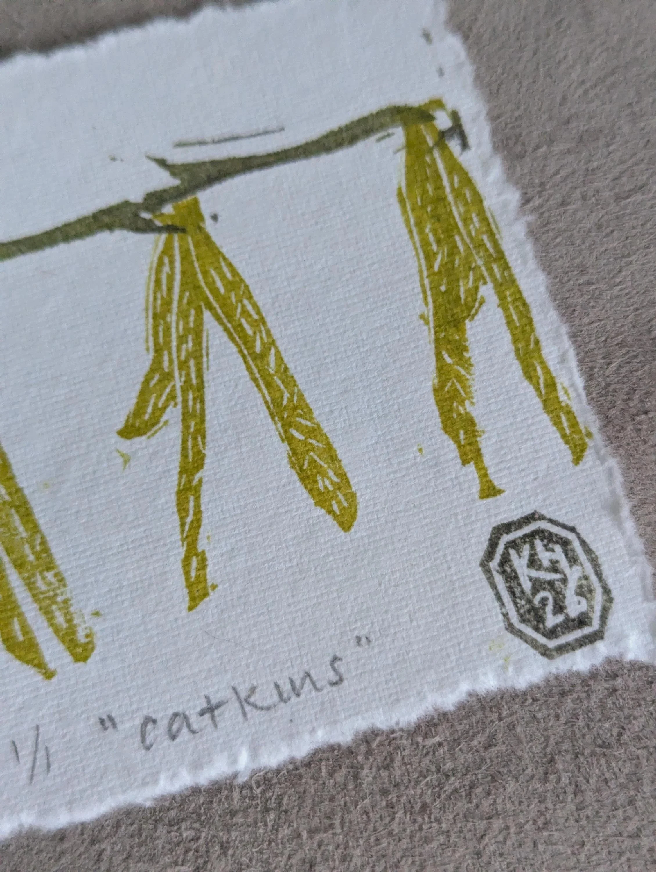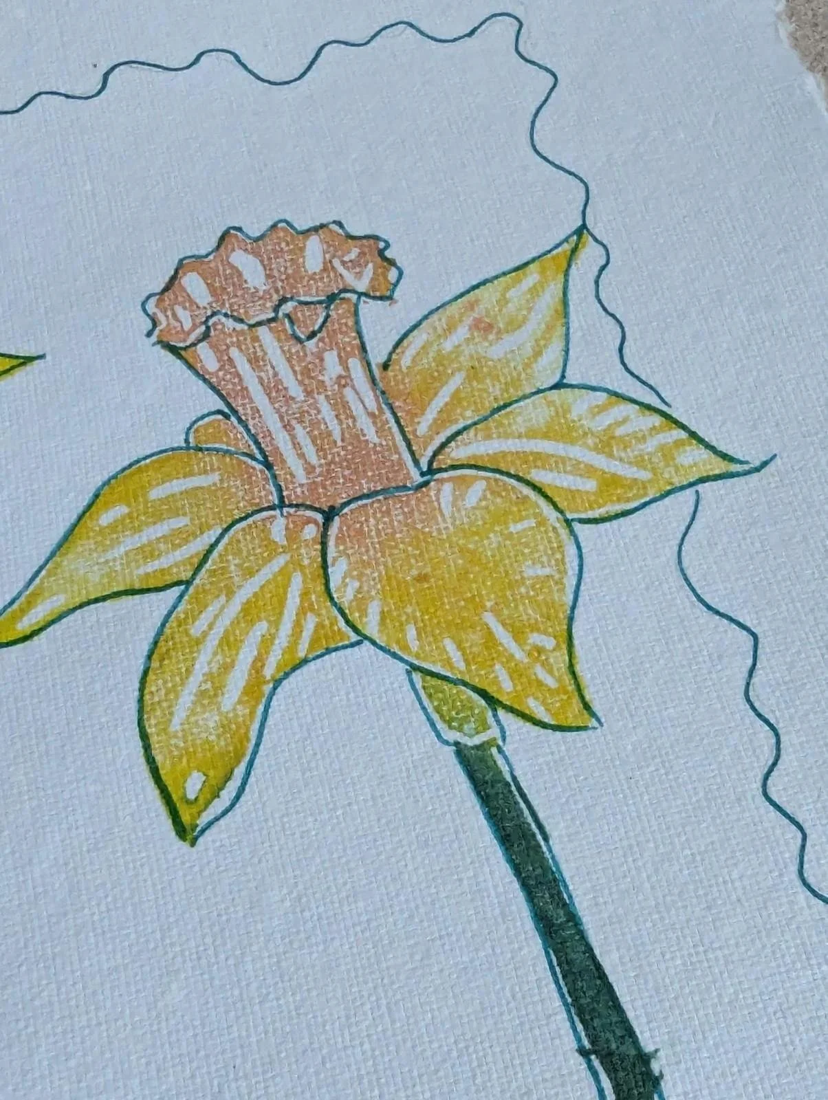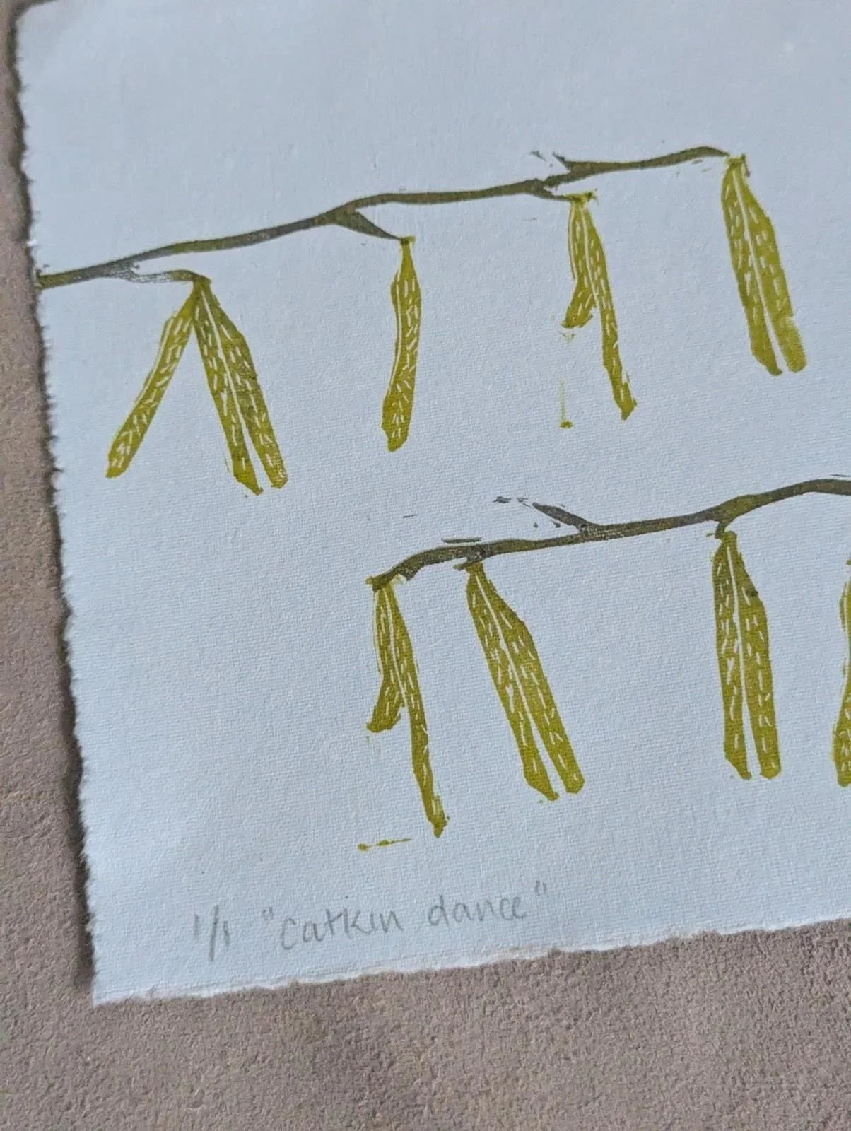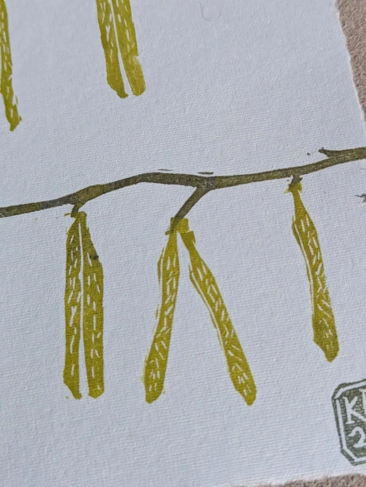 Printed by hand onto a soft powder blue cotton rag paper using hand-carved rubber blocks and a blend of archival inks. Each element has small differences in tone and texture, which is part of what makes it feel human and lived-in. On this print the daffodils have been outlined with a dark green micron pen also.