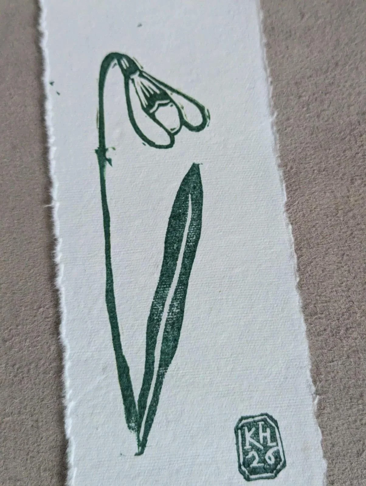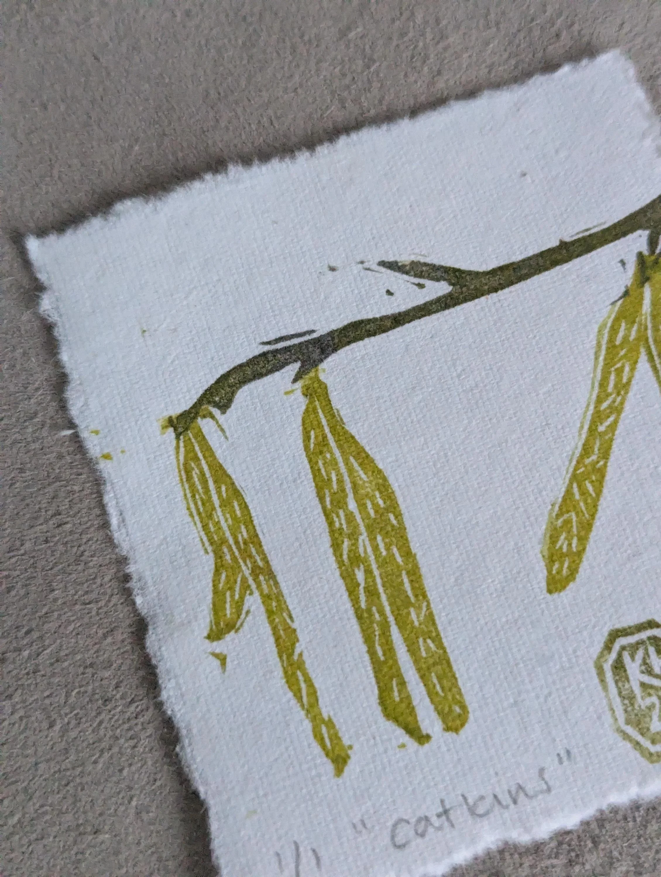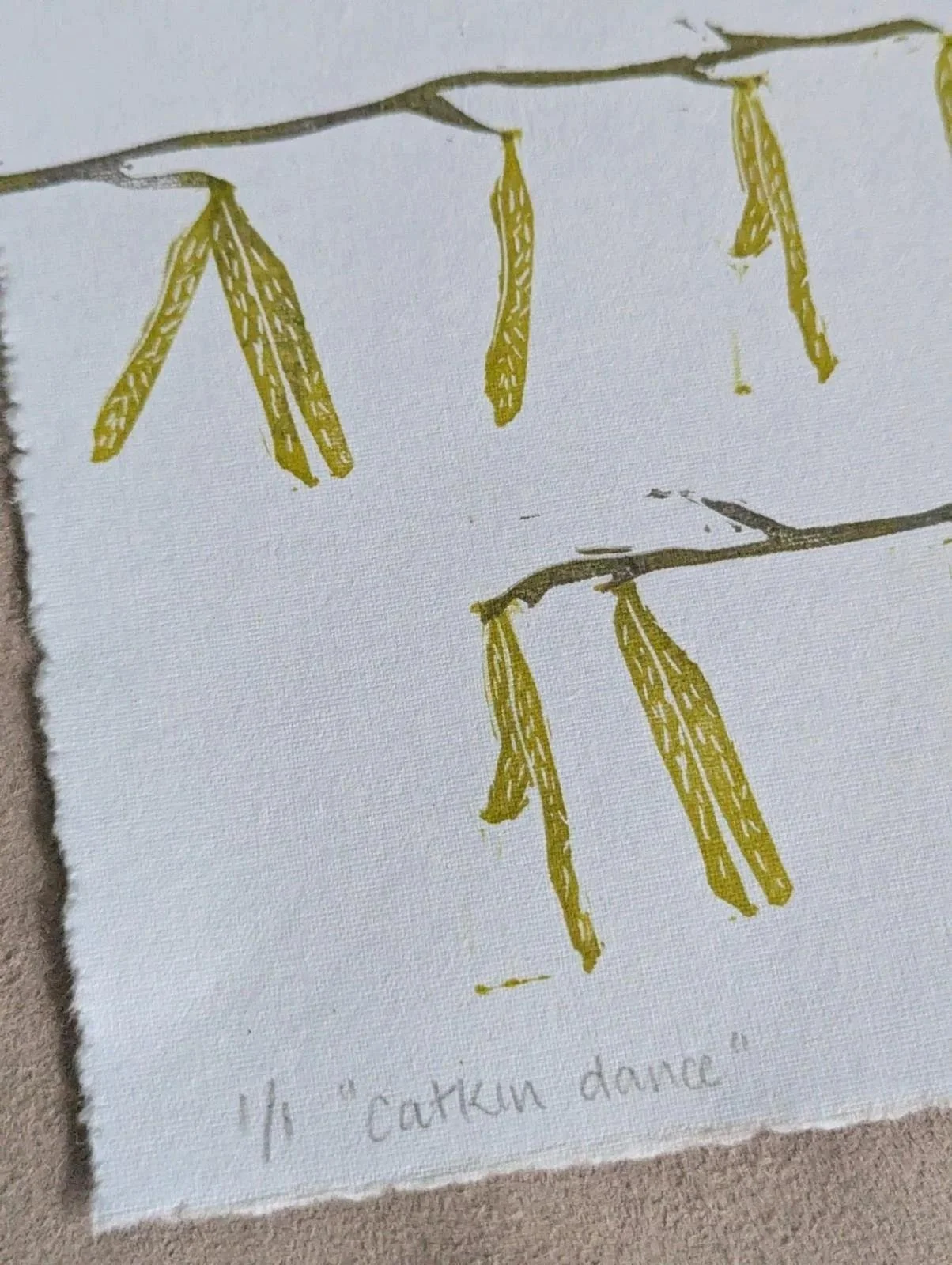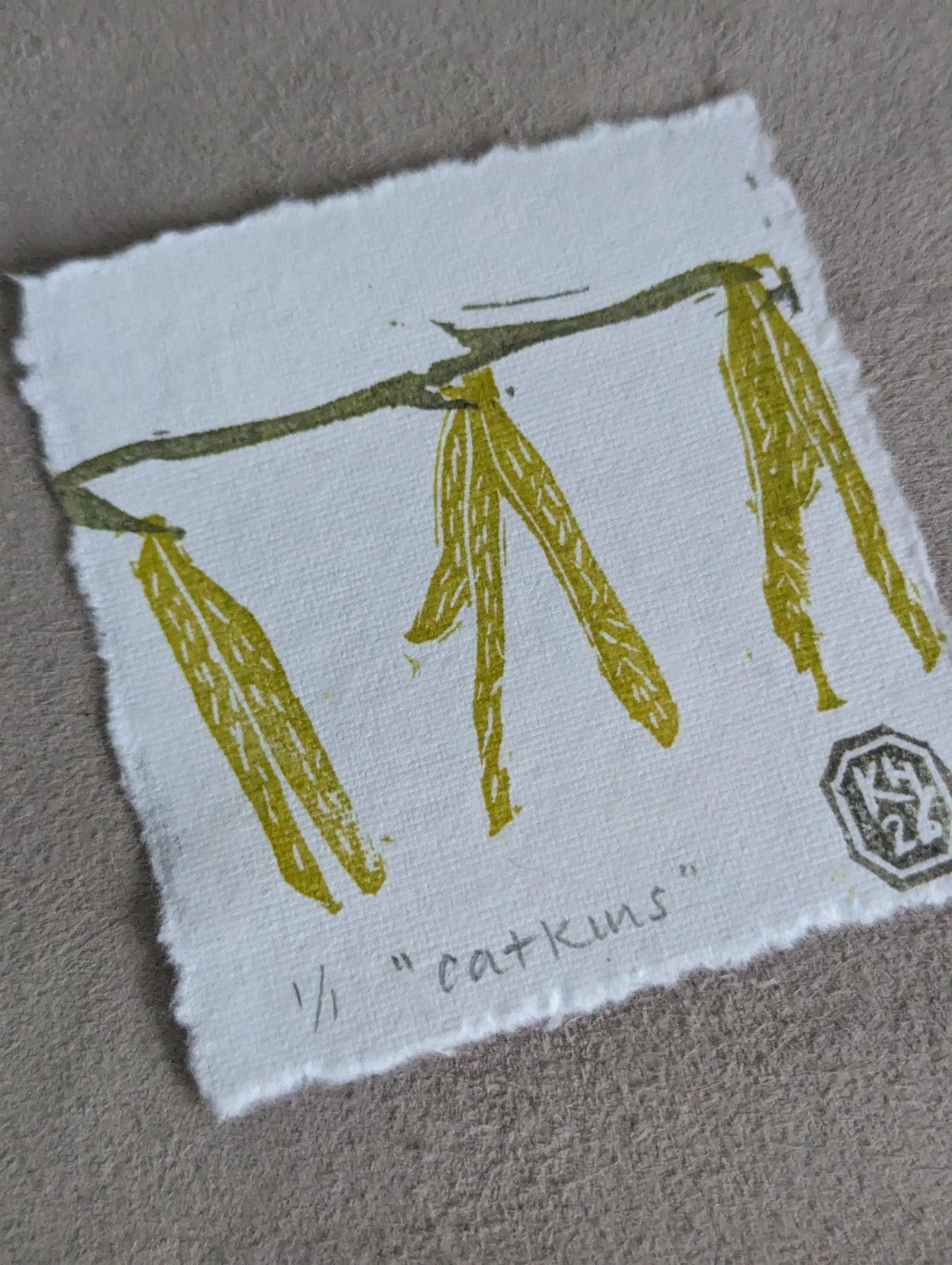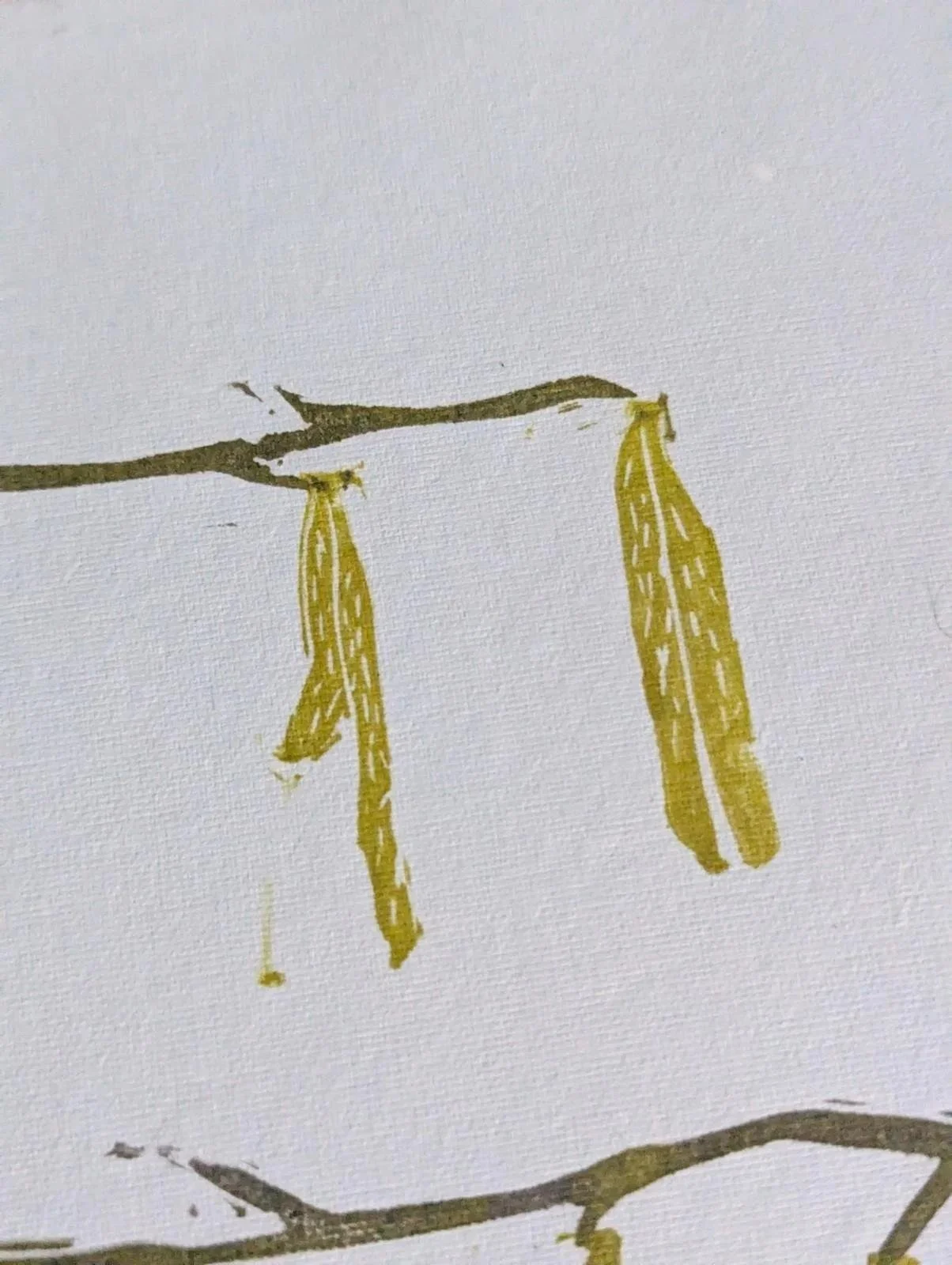 Printed by hand onto a soft powder blue cotton rag paper using hand-carved rubber blocks and a blend of archival inks. Each element has small differences in tone and texture, which is part of what makes it feel human and lived-in. On this print the daffodils have been outlined with a dark green micron pen also.