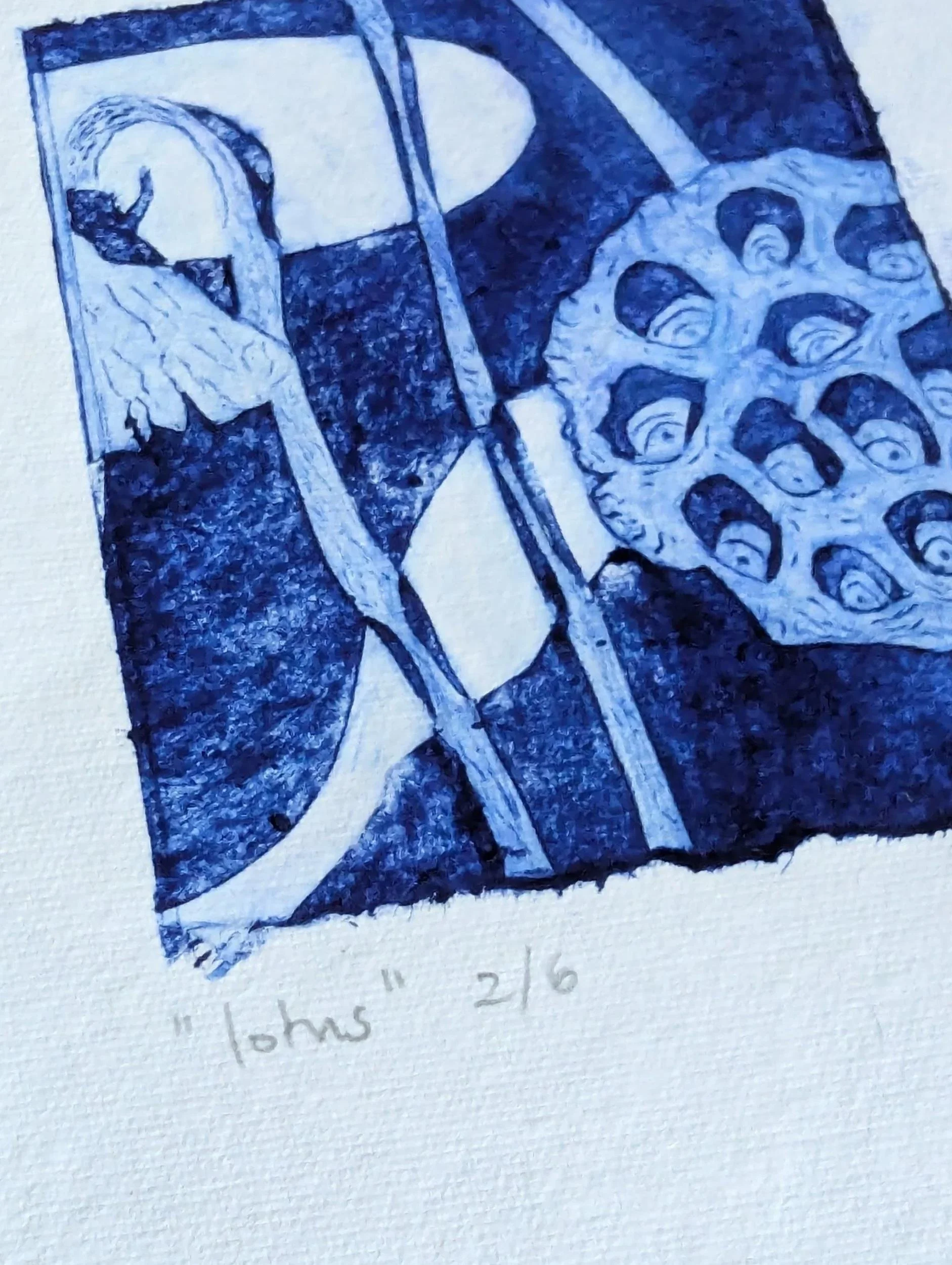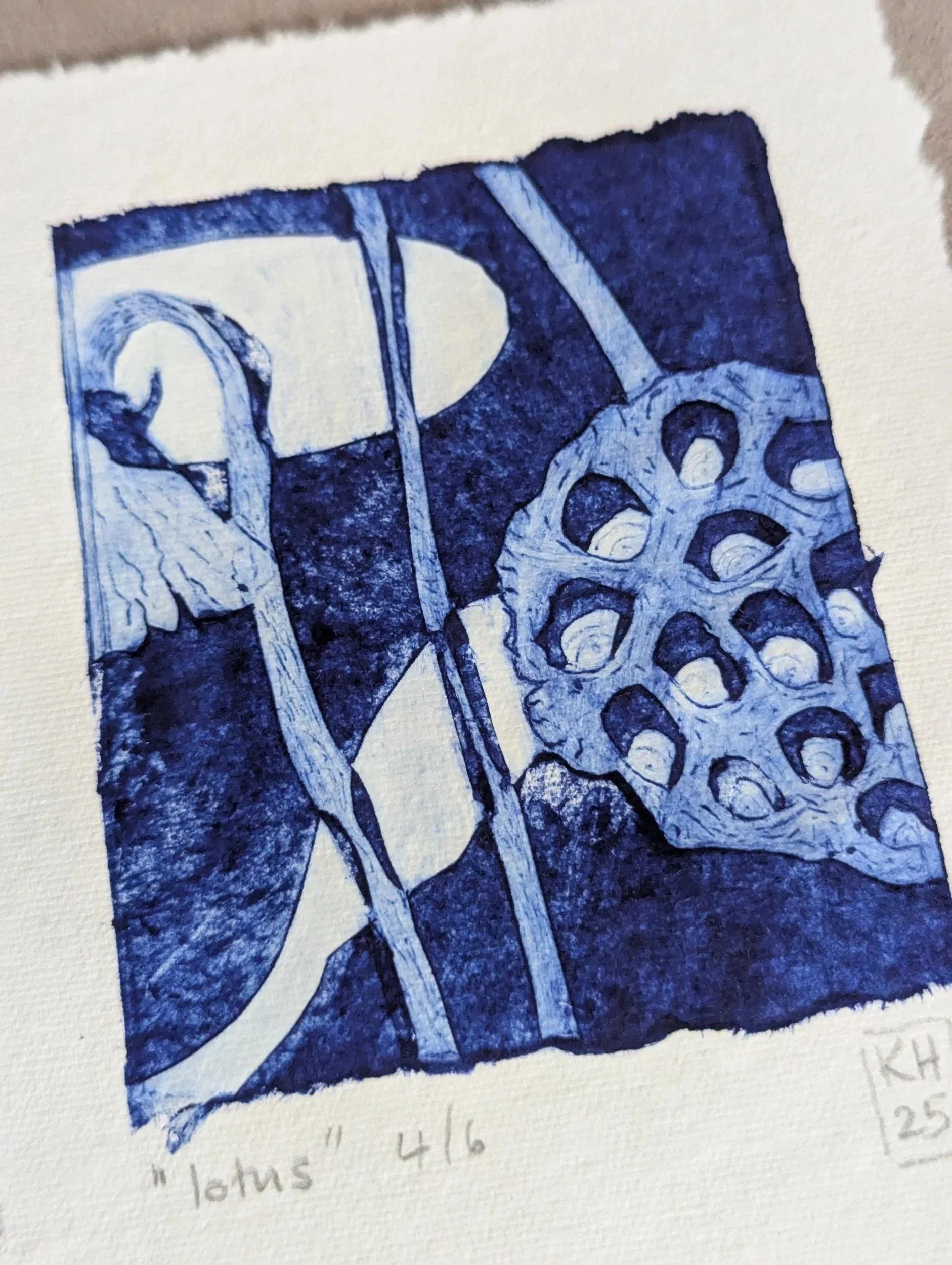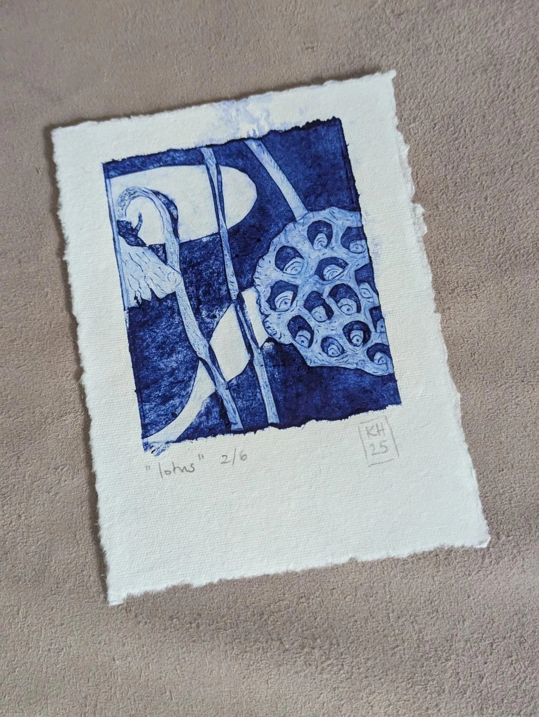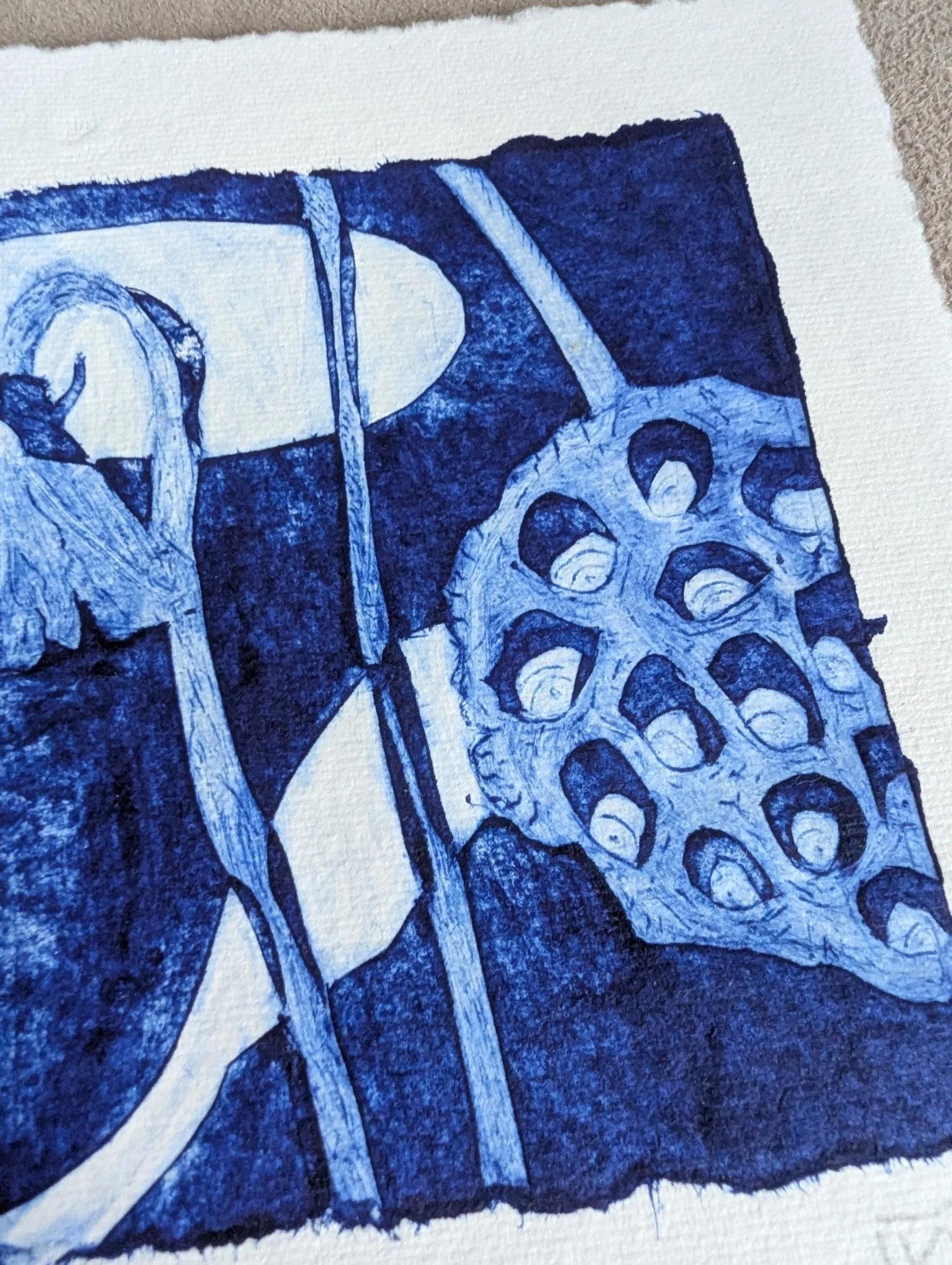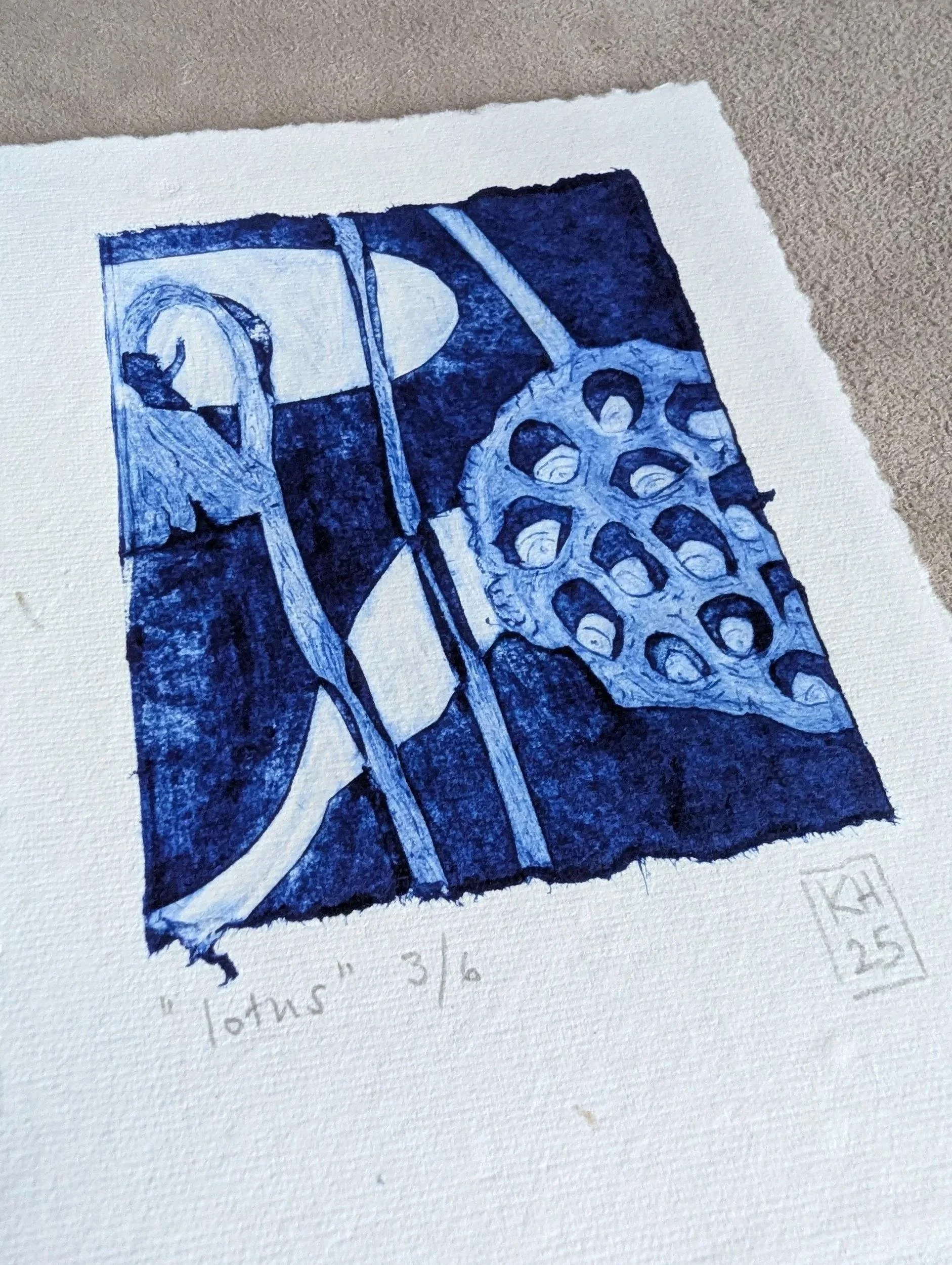 The printing plate for this delicate, architectural poppy seedhead was made from a juice carton. With tetrapak printing you inscribe the plate and remove the surface to create the lines and darker areas - roll on your ink and then wipe anything you want to be white off. I tore the edges of the plate to add visual interest.