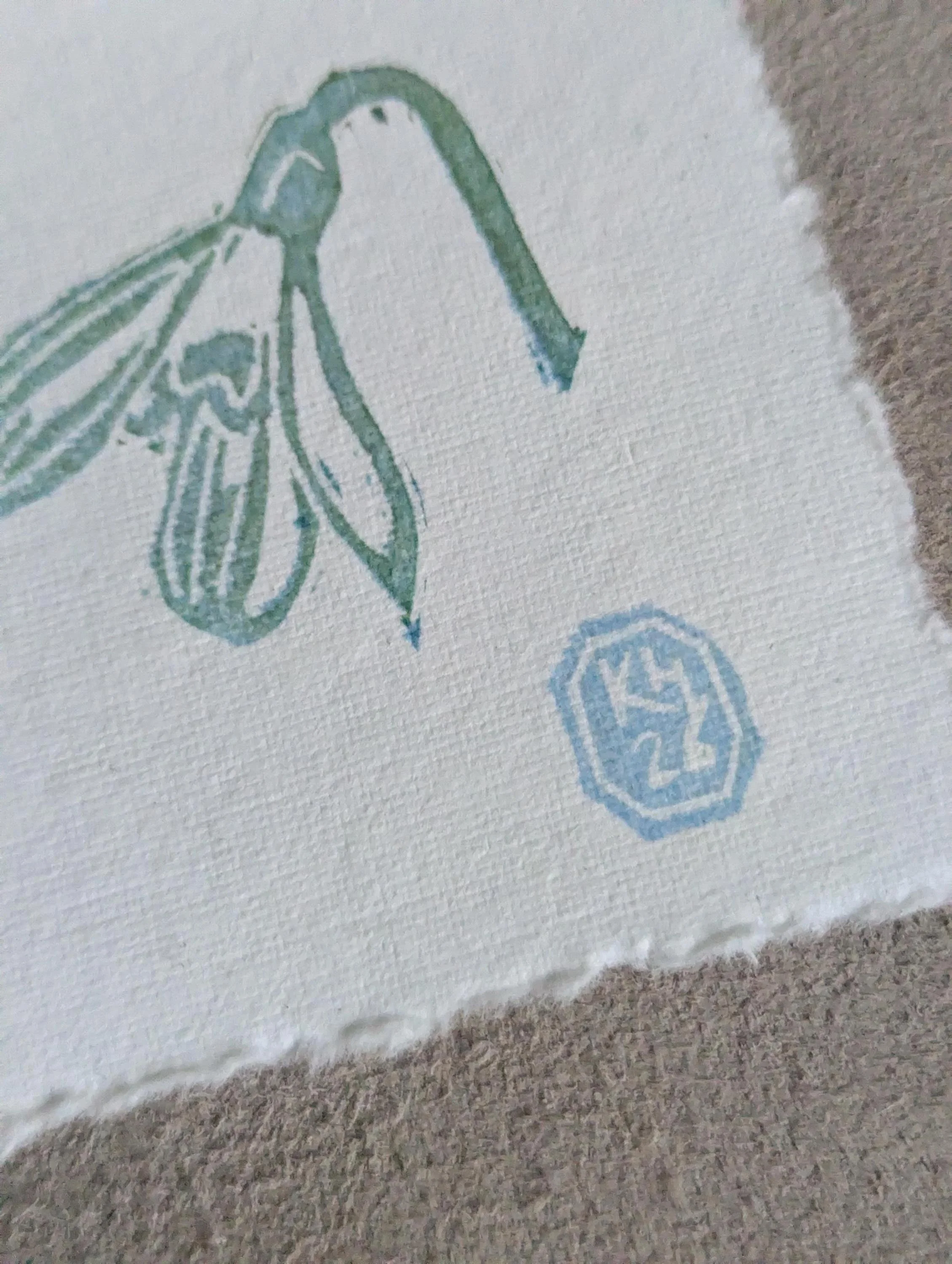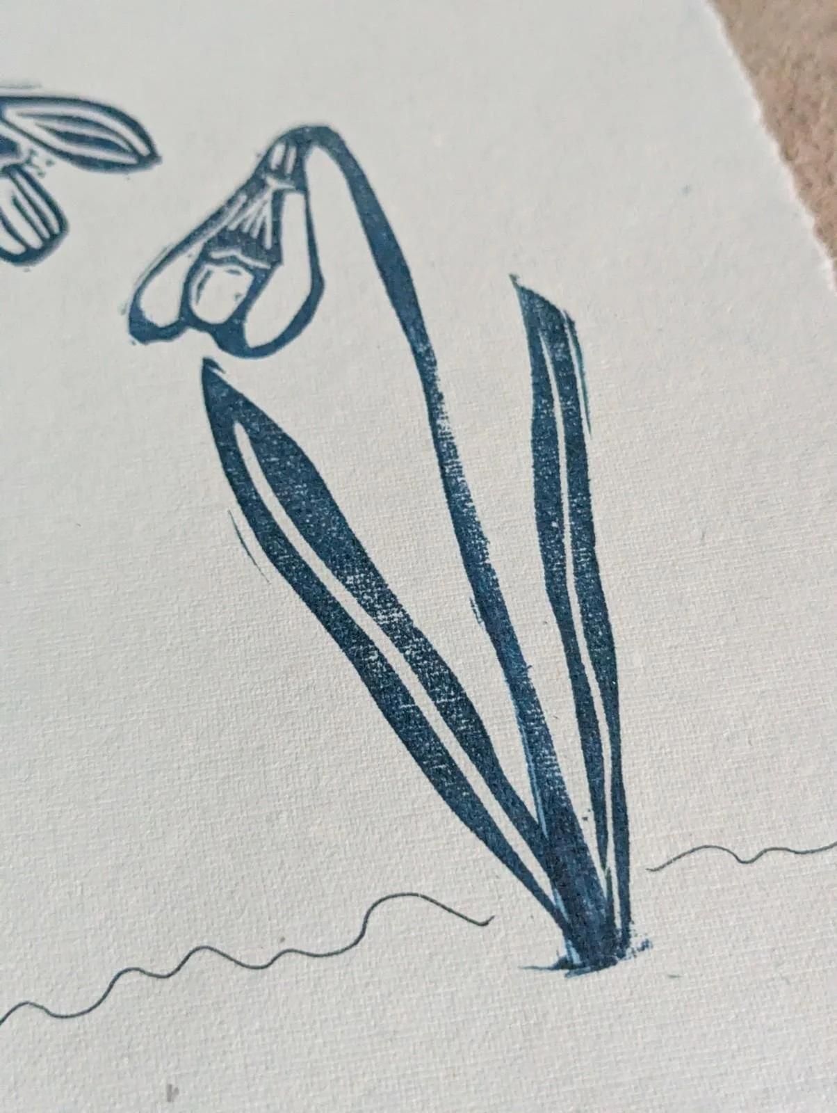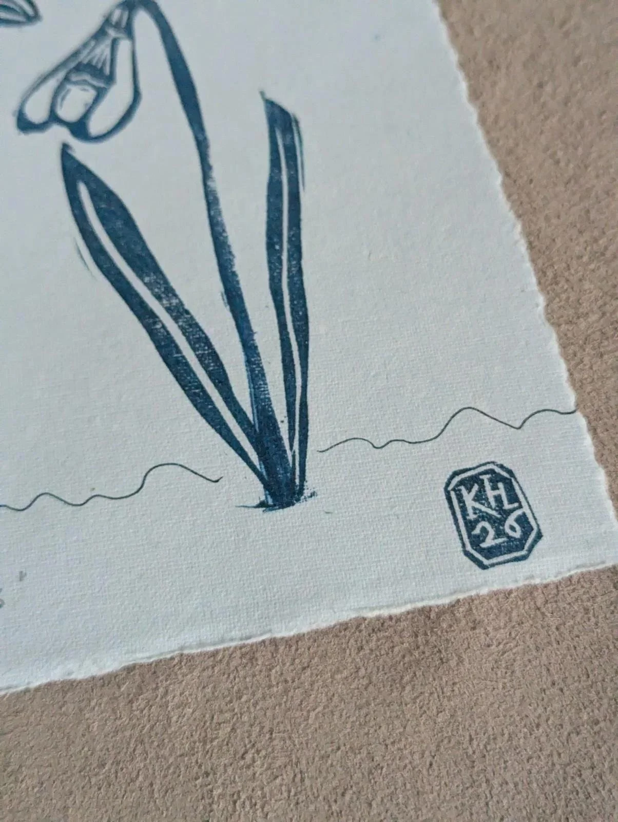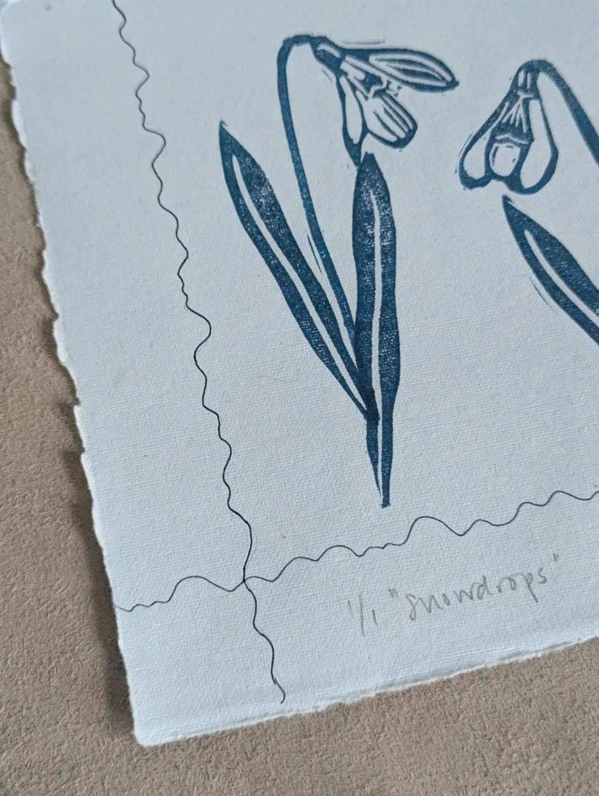 This hand-printed piece features a pair of graceful and sculptural snowdrops. It's a sight that always makes me smile because it heralds sunshine and warmer days being on the way after the dreariness of winter. This is a piece to uplift the soul and bring joy.